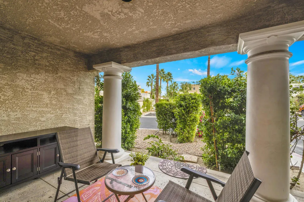 MAJOR PRICE IMPROVEMENT AND PRICED TO SELL!! Best value in sought-after South Palm Springs! Located in highly desirable south Palm Springs--away from airport traffic and wind--this freshly remodeled two-bedroom, two-bath condo sits in the charming, snowbird-friendly community of Esprit. Recently painted in a soothing palette of light beige and white, the home features updated recessed LED lighting with dimmers, a sleek new living-room ceiling fan, and a timeless dining fixture.The custom two-toned fully redone kitchen is both stylish and functional, offering soft-close shaker cabinets with pullouts, brand-new never-used LG ThinQ stainless appliances, white quartz counters with silver specks, an expanded waterfall-edge breakfast bar, and a marble backsplash.The open floor plan maximizes space, with two well-sized ensuite bedrooms. The primary bathroom includes a new vanity with quartz counters and plenty of storage while the guest bathroom has dual sinks, updated faucets, new shower head and glass shower door. Throughout the home, new white horizontal and vertical blinds add a clean, modern touch.Enjoy two patios--one off the living room and another off the primary bedroom. The neutral beige tile flooring runs seamlessly throughout the unit. Tucked quietly at the back of the community, this ground-level corner end unit offers exceptional privacy with no shared walls.Sold partially furnished with a well-stocked kitchen, this move-in-ready home makes it easy to settle in and start enjoying everything Esprit and Palm Springs have to offer.