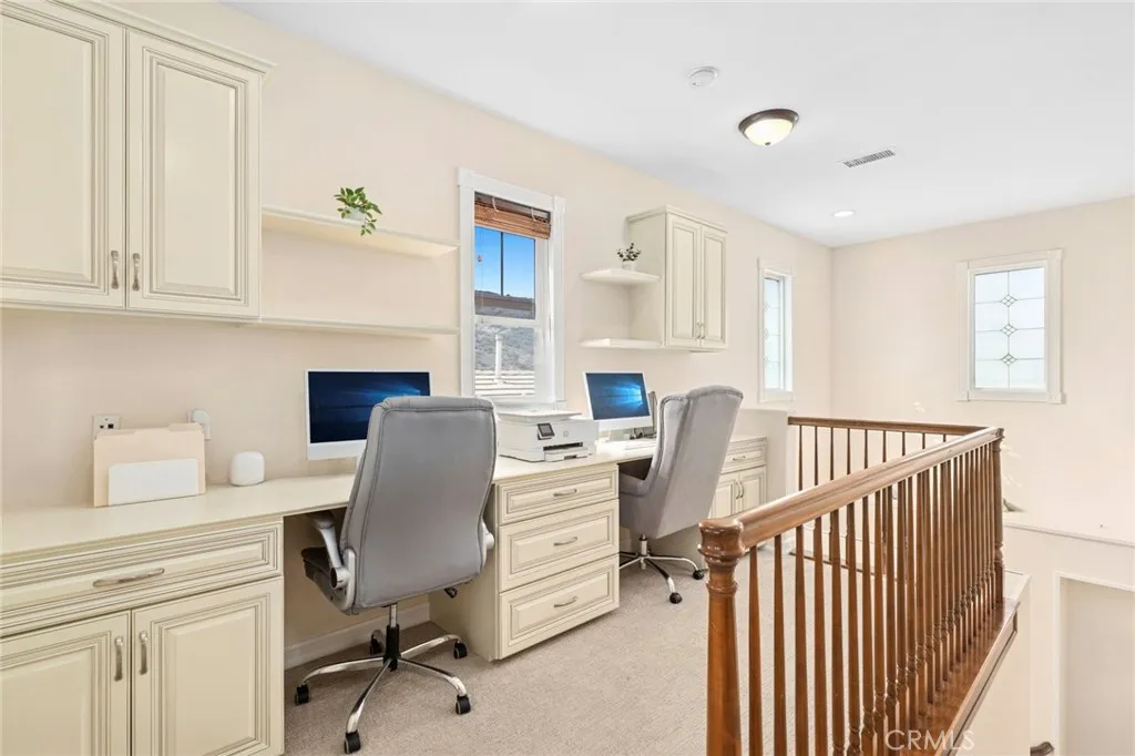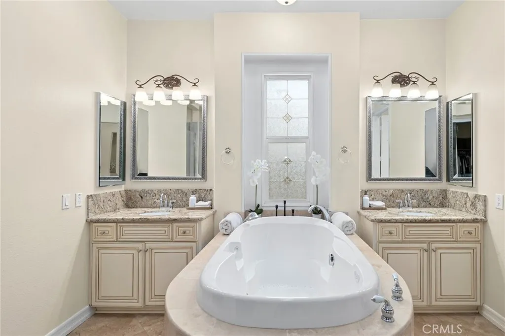 Welcome to 22526 Amber Eve Drive, set within The Retreat—Temescal Valley’s premier 24-hour guard-gated community. Situated at the end of a quiet cul-de-sac, this beautifully maintained residence showcases panoramic 180° mountain views and a highly versatile floor plan that lives like a single story, complemented by an additional upstairs suite. The main level features three bedrooms and two-and-one-half baths, along with formal living and dining areas and a spacious family room filled with natural light. The upgraded kitchen highlights French-country cabinetry, granite countertops, a large center island, stainless-steel appliances, and newer vinyl plank flooring—offering both function and style. At the heart of the home, an open-air interior courtyard with its own fireplace creates a seamless connection between indoor and outdoor living—ideal for entertaining or relaxing. Upstairs, a private loft/office, large bonus room, full bath, and an additional bedroom provide flexible space for a guest suite, media area, or creative use. Outdoors, the backyard delivers an impressive vantage point with unobstructed 180° mountain views, offering a tranquil setting for morning coffee or sunset evenings. Additional highlights include a tandem three-car garage, energy-saving solar panels, two main-level fireplaces, and a premium end-of-cul-de-sac location. Residents of The Retreat enjoy beautifully maintained grounds, 24-hour guarded entry, and convenient access to nearby shopping, dining, golf, and major commuter routes. This is a rare opportunity to own a view home with a flexible layout and timeless appeal in one of Temescal Valley’s most sought-after gated neighborhoods.