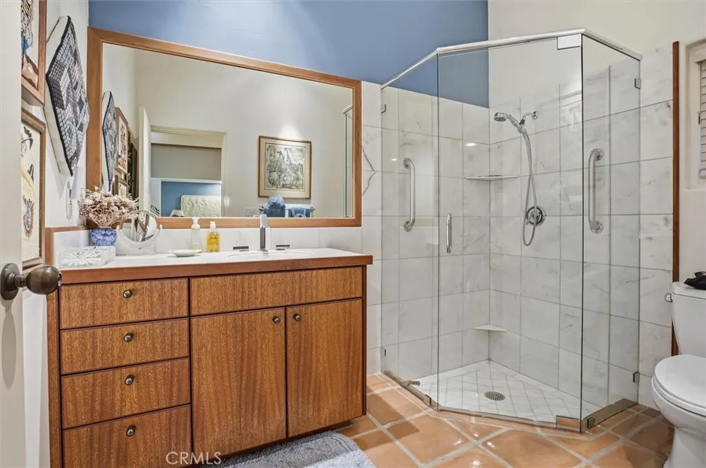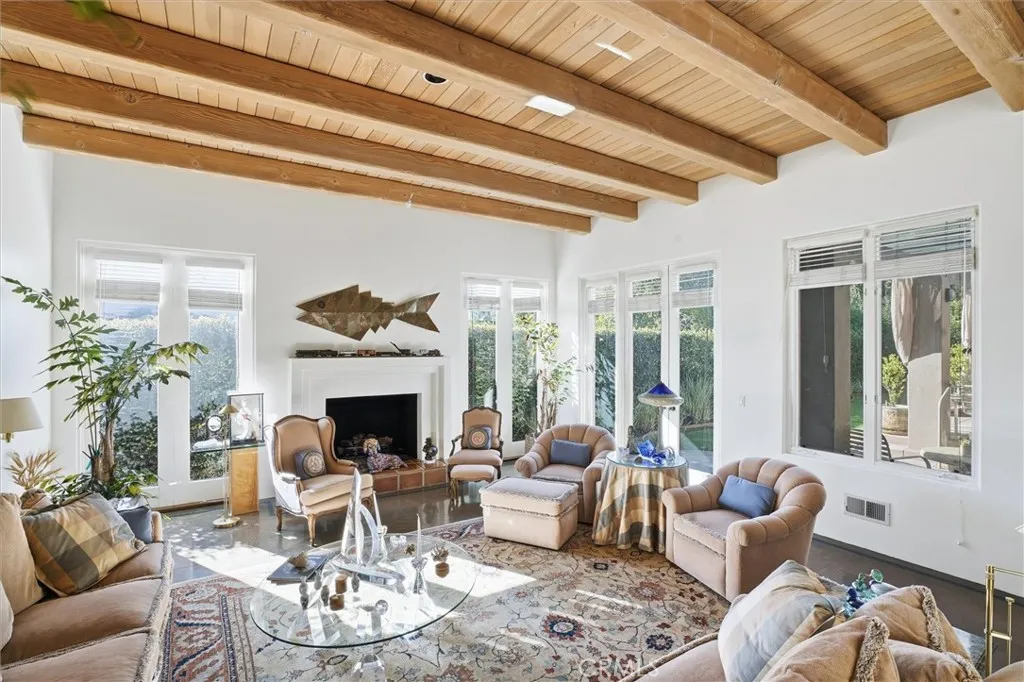 Experience timeless Montecito-inspired elegance in this beautifully crafted custom home. From the moment you arrive, the home’s architectural character stands out. A private courtyard entrance, tall arched front door, and dramatic, playful entry sequence set the tone. Step inside and be greeted by a Zen-like atrium with a spectacular waterfall feature, creating an immediate sense of calm and sophistication. Throughout the home, high ceilings with exposed wood beams, smooth stucco walls, and polished Saltillo tile floors enhance the warm, authentic style. The luxurious primary wing offers exceptional privacy, beginning with a beautiful office featuring custom built-ins. The expansive primary suite includes a serene sitting area, fireplace, and spa-like full bathroom with two separate vanity areas. The two guest ensuites are thoughtfully designed at the opposite end of the home, ideal for privacy and comfort—one of which currently serves as a perfect den. The living room and formal dining room combine into one expansive, inviting space, centered around a striking fireplace flanked by French doors and large picture windows. The sun-filled kitchen is both stylish and functional, offering a large center island, Sub-Zero refrigerator, and 6-burner Thermador range. The adjoining breakfast area, complete with its own fireplace and French doors, opens to a lovely patio—perfect for morning coffee or relaxed al fresco dining. Enjoy lower utility costs with the home’s owner-owned solar system, a valuable upgrade that provides efficient, eco-friendly power. Rich architectural detail, elegant indoor–outdoor flow, and a uniquely serene atmosphere make this home a one-of-a-kind offering.