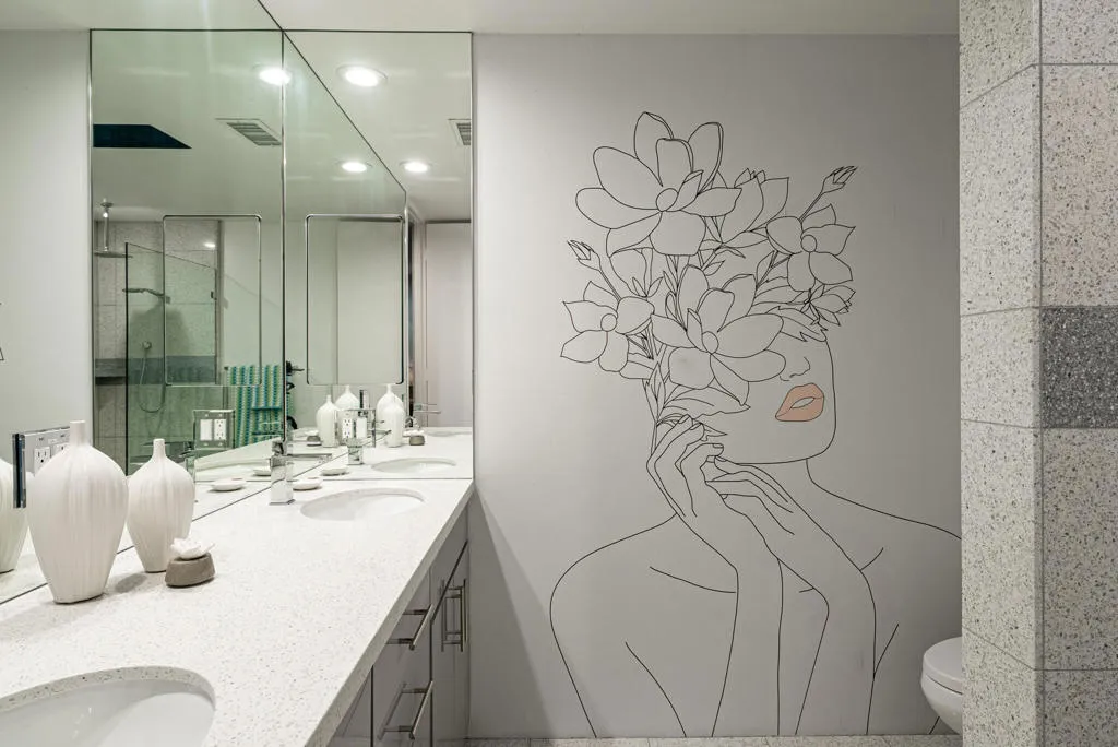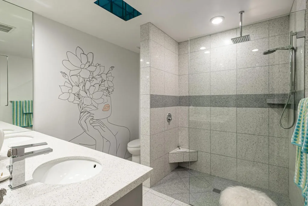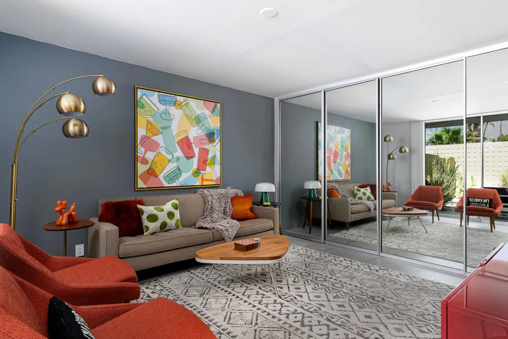 This beautifully remodeled 2bed/2bath home is just waiting for you to call home at the coveted Seven Lakes Country Club. Originally designed by Richard A. Harrison, inside its mod shadow-blocked walls, you'll find a spacious unit updated for today's living. Spread out over the 1,545 sq ft open floor plan, highlighted by light terrazzo tile floors, get ready to entertain in style! The remodeled kitchen is finished with KraftMaid grey cabinetry, sparkling stainless steel appliances, and ample quartz countertops, including a large breakfast bar. Walls of glass sliders open out onto a green leisure terrace with views of the mountains and the iconic Southridge estates. Enclosed for maximum privacy, the northern window wall opens onto a large private courtyard lined with a desertscaped perimeter garden. Both spacious bedrooms offer great closets as well. An assigned two-car garage is available while the tranquil pool is just steps away. The roof has been recently recoated as of July 2025. Past the 24-hour guarded front gate, 'The Gem of the Desert' offers a unique elevated lifestyle with its Ted Robinson-designed 18-hole executive golf course, 15 pools and spas with poolhouses, and the lively William Cody-designed clubhouse with a formal dining room, casual cocktail lounge, and a terrace overlooking the waterfall-fountain. Welcome home!