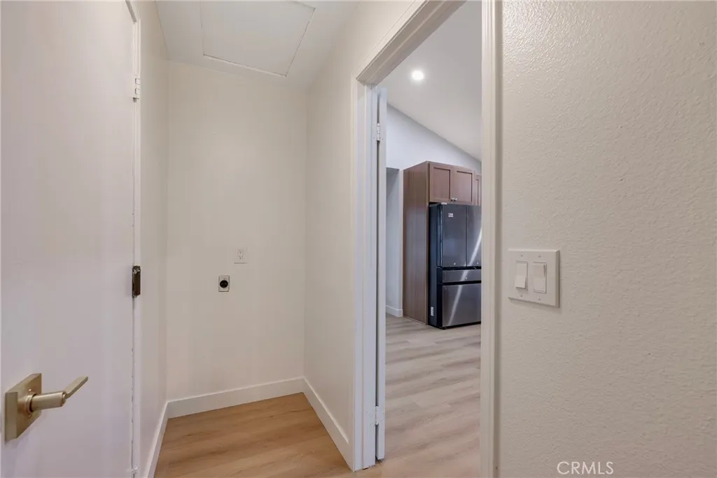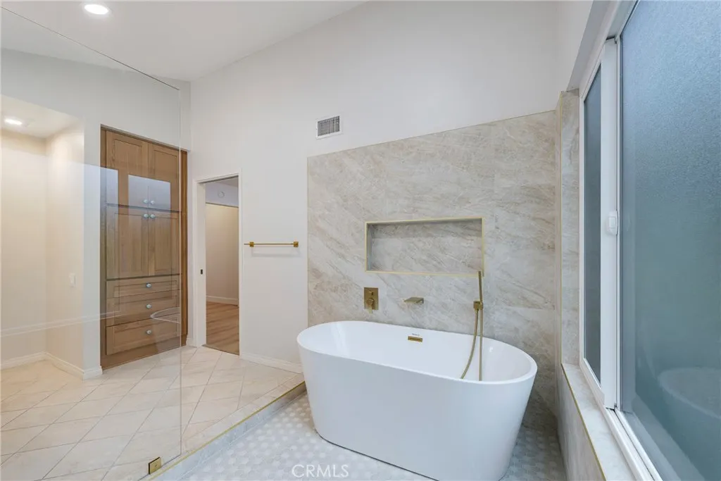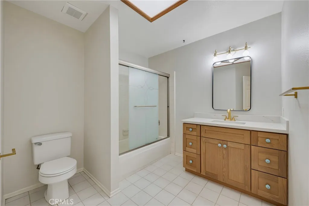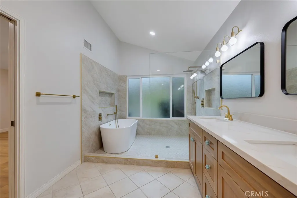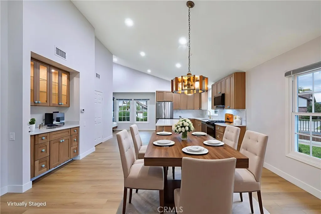 Beautifully updated and thoughtfully redesigned, this home offers more than $100,000 in recent improvements and a fresh, open feel throughout, along with an opportunity to convert the layout into a 3-bedroom home. A proposed floor plan modification would create an additional bedroom and closet within the existing nook area, along with repositioning the kitchen island and relocating the refrigerator. This concept is supported by a quote of approximately $7,500 and includes flooring and cabinet modifications to ensure all finishes match with new materials. The kitchen is the centerpiece of the renovation, where the original low ceiling was raised to a vaulted design, creating a bright, airy atmosphere that transforms the heart of the home. The wall between the kitchen and dining room was removed as part of a well-planned update that expands the kitchen’s footprint and creates an open connection between the main living areas. Just off the dining area, a charming atrium brings natural light into the home and creates a peaceful spot for morning coffee, plants, or outdoor relaxation. The remodeled kitchen features new custom cabinetry, striking gold-vein quartz countertops, updated fixtures, and an enlarged layout ideal for cooking, gathering, and entertaining. New wide-plank flooring, soft neutral paint, updated lighting, and refreshed finishes throughout contribute to the home’s warm, cohesive style. The primary suite has been reimagined into a comfortable retreat with a beautifully upgraded spa inspired bath that includes a custom double vanity, a walk-in shower with updated quartz surround, a freestanding soaking tub, a private water closet, creating a calm atmosphere. The secondary bathroom has also been refreshed with a new wood vanity, gold-vein quartz countertop, and updated light fixture, providing a clean and inviting space that complements the home’s overall design. Additional improvements include improved interior flow, enhanced sightlines between rooms, upgraded hardware, thoughtful lighting selections, and refinished interior surfaces. Furniture added via virtual staging to illustrate furnishing possibilities. Located near local dining, shopping, parks, and area conveniences, this home blends modern updates with an inviting layout designed for everyday living. The extensive enhancements, redesigned kitchen and primary suite, and cohesive finishes throughout create an appealing move-in opportunity in the heart of Anaheim Hills.