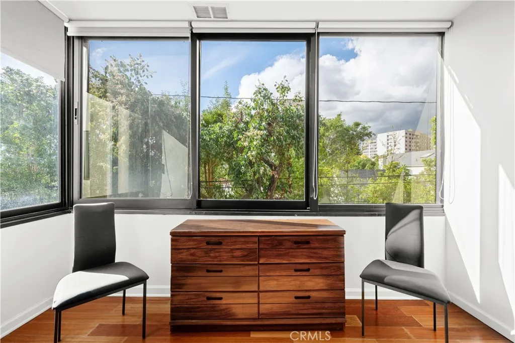 Welcome home to 1,628 SF of quiet living space touting large open rooms warmed by hardwood floors and two gas fireplaces. Unit 405 is a stunning west facing 2 bedroom, 2.5 bath, back unit. The living room and fireplace, the dining room, the kitchen and enclosed patio, the oversized windows, all conspire to create an exceptionally inviting space ready for a busy life. Imagine the holidays and celebrations! When it's time to rest, the main bedroom is a lovely, spacious, private retreat with a fireplace, two walk-in closets, a gorgeous remodeled en suite and inspiring views. The en suite has been beautifully redesigned featuring the safety of a large curbless shower that's big enough to accommodate a chair. A second beautifully remodeled bath is across the hall from a large, bright guest bedroom. A third half bath, off the foyer, has a touch of breathtaking whimsy in its modern jungle design. Both bedrooms and the living room have neighboring trees and blue sky outside every window. This delightful home has many practical attributes, too: high ceilings, central heat and air, plenty of closet space, recessed lighting, in unit W/D, a breakfast nook, stainless steel appliances, granite countertops and a gated garage. Plus, getting groceries from car-to-kitchen is simple when the parking spaces are adjacent to the door entering the building. There's also a gym, pool and spa. Living in a winning location, a half block south of Wilshire, makes walking fun and commuting a breeze. Spend more time enjoying life and less time driving, with Westwood Village, UCLA, the Century City Mall, parks, the 405 Fwy, and more, all close by.