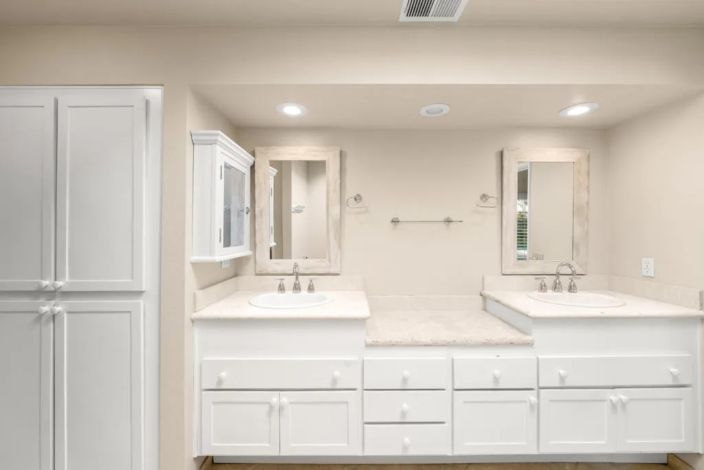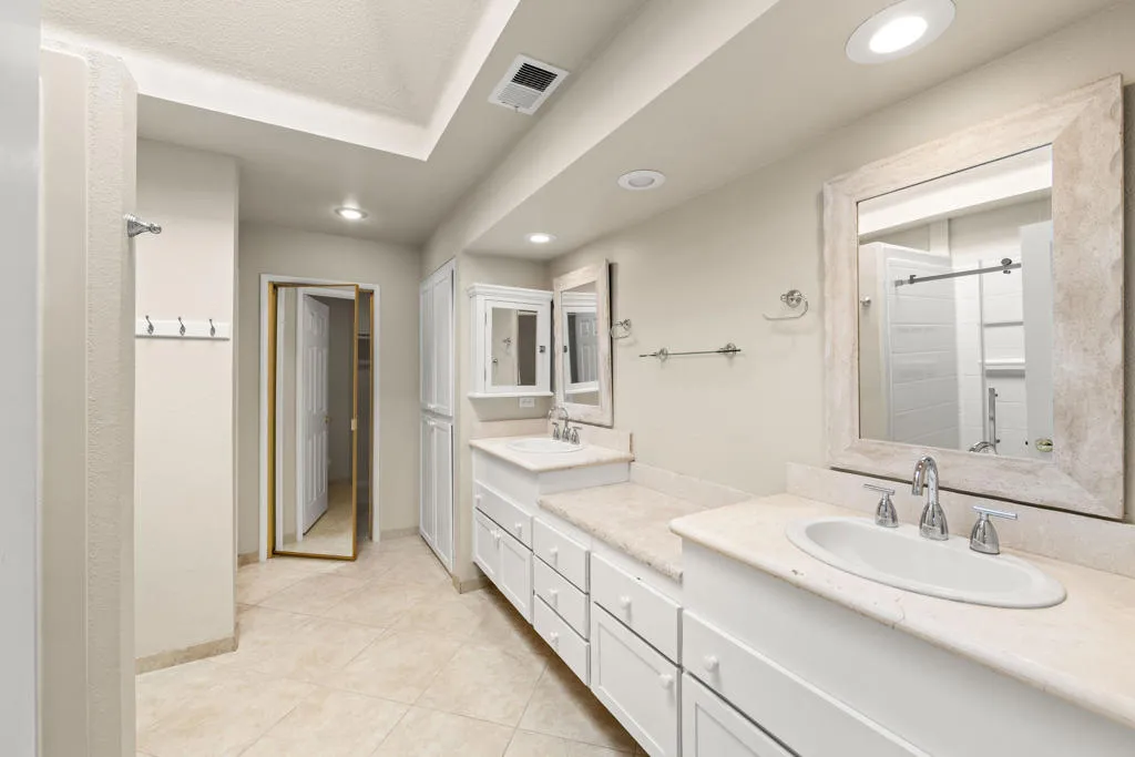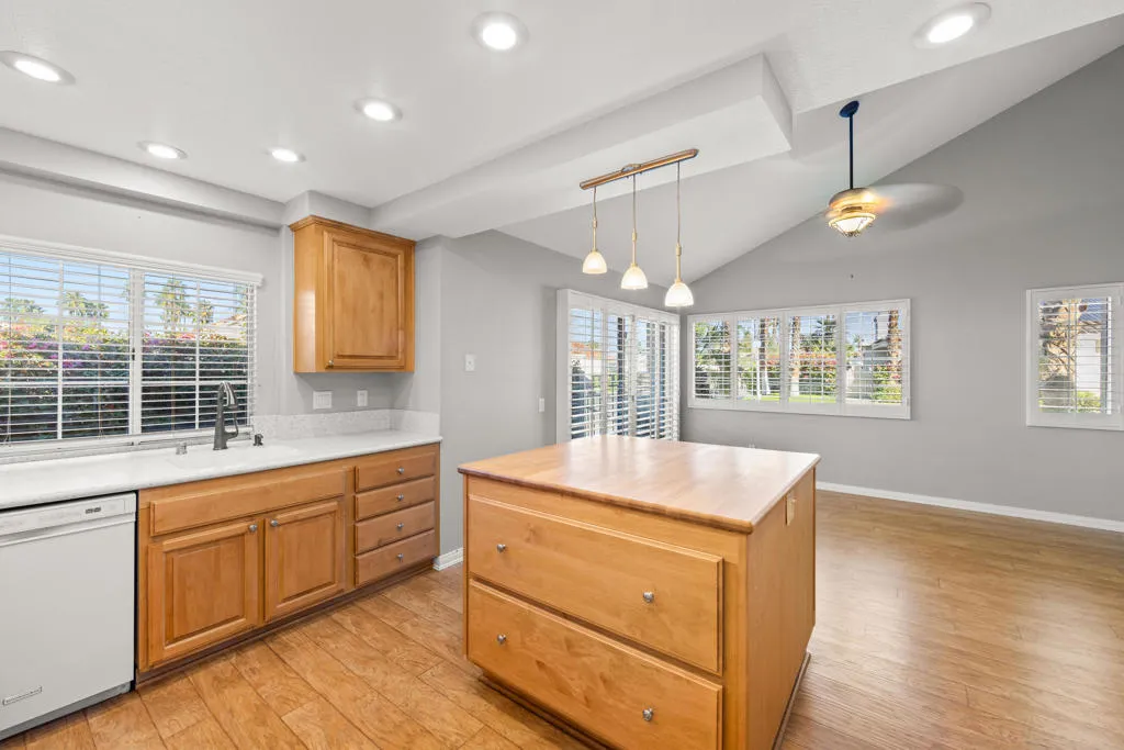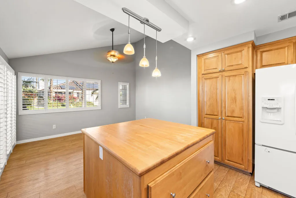 Lovely 3 bedroom, 2 1/2 bath, pool/spa home, situated on a corner lot, in one of the best locations in Palm Desert, one block from I.W. Tennis Garden. Lushly landscaped backyard features pool/spa, and peek-a-boo views of the Santa Rosa Mountains. Spacious living room w/ fireplace, vaulted ceiling, with patio and pool views. Large Master bedroom, vaulted ceiling, large double sink vanity and plenty of cabinets, step-in shower, large walk in closet, Third bedroom has been converted to office (w/built-ins) plus, a built-in Murphy bed for extra guests. Newer carpeting and wood laminate flooring throughout. Spacious kitchen w/large, butcher block top island, oversize pantry w/ pull-outs and adjacent morning room plus, an adjacent formal dining room. Separate laundry room. Two-car attached garage, built-in cabinets and direct access. Shutters throughout. Gated, Desert Breezes Resort features a club house with fully equipped gym, tennis, pickleball and basketball courts. No additional membership required, included in HOA fee. Monthly HOA also includes front yard maintenance and irrigation. Plus, weekly trash pickup.