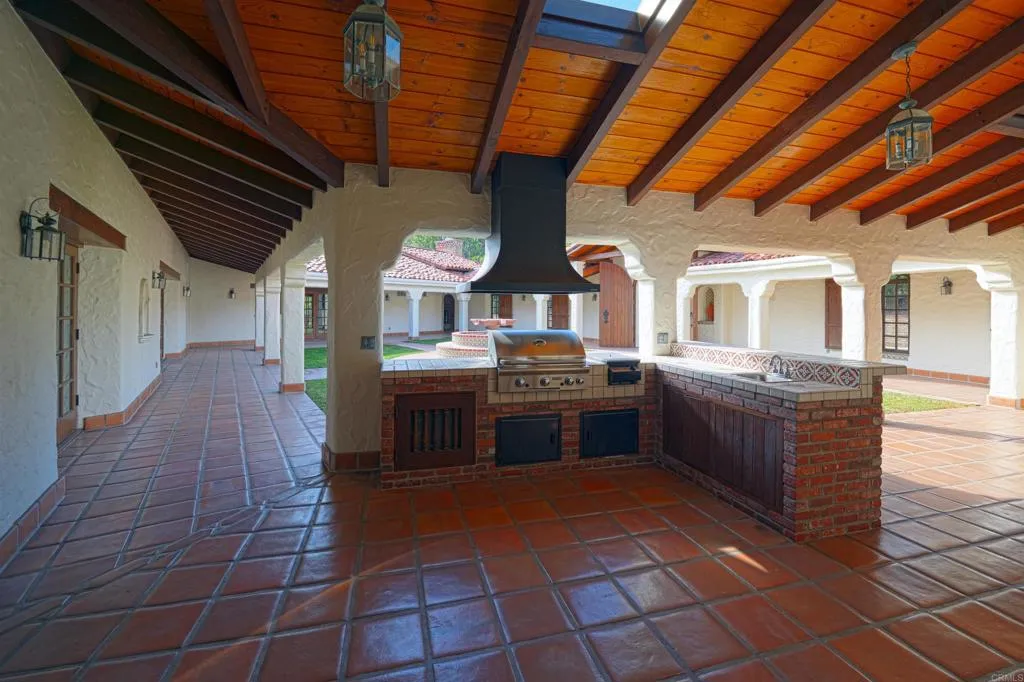 Ralph H. Reisinger-designed 1994 Spanish hacienda, single-owner, never remodeled, original condition. 4 BR | 3.5 BA | 3,774 sq. ft. Classic U-shaped plan centers on a tiled Cantera fountain courtyard. Deep covered arcades wrap three sides with banks of French doors opening from nearly every room. Saltillo tile floors indoors and out. Exposed beam ceilings, arched doorways, barrel-arch passageways, four fireplaces (two-sided living-dining, family room, primary). Primary wing: bedroom with fireplace, sitting room, walk-in closet, en-suite + adjacent private study with separate courtyard entrance. Guest wing: Two ground-floor bedrooms and a second-story casita with full bath and large loggia overlooking courtyard and southern valley. Covered outdoor kitchen/grill in arcade. 3.18 gently sloping acres with mature gardens, eucalyptus, citrus, lawns and room for guest house, pool, tennis, stables or vineyard. Deep drive-through garage. Authentic Cliff May-inspired Covenant hacienda with expansion land.