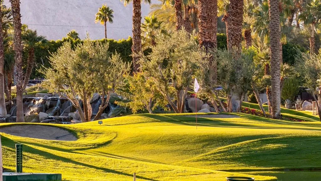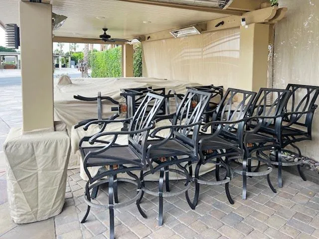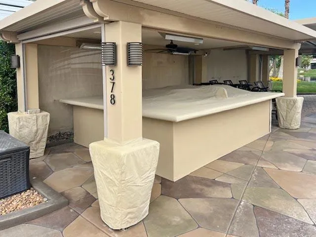 Outdoor Resort Indio is a Class A only RV Resort.This spacious 2,613 sq ft lot captures one of the most beautiful vistas in Outdoor Resort Indio--stretching across the scenic Phase 7 golf course with its shimmering ponds, graceful bridges, and cascading waterfalls. The location offers a sense of serenity and space, with no shortage of resort convenience--just a short walk from a nearby satellite pool and all the amenities that make ORI such a special place to spend the winter season. A surfaced RV pad and L-shaped Alumawood pergola with pavers below create the perfect balance of comfort, shade, and style.Designed for relaxed entertaining, the outdoor living area features a large U-shaped kitchen with a wrap-around bar, six ceiling heaters, three ceiling fans, and an electric sun screen for your comfort. Two large flatscreen TVs on lifts, one in the kitchen and one in the living area equipped with a Sonos sound bar make for a great way to relax. There's plenty of room to host family and friends with a large expandable dining table and seven bar chairs that make gathering easy. Two drop down electric sun shades, one in front and one in the rear, and a retractable power awning with dropdown shade behind the coach make controlling the sunlight easy. From sunrise coffee to evening cocktails overlooking the lakes and waterfalls, this lot elevates the art of RV living in every detail.