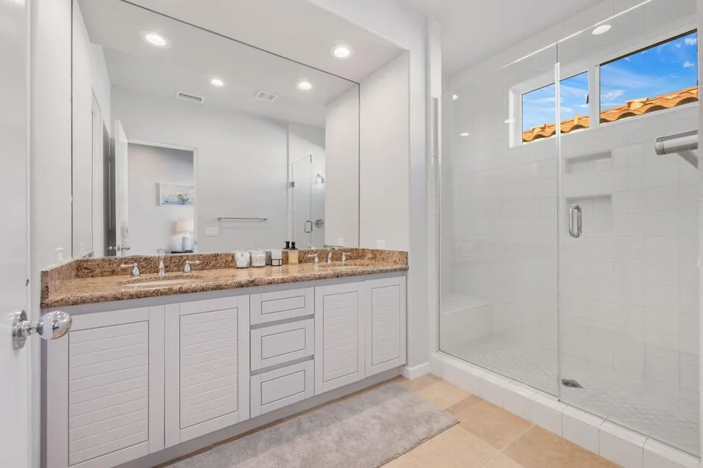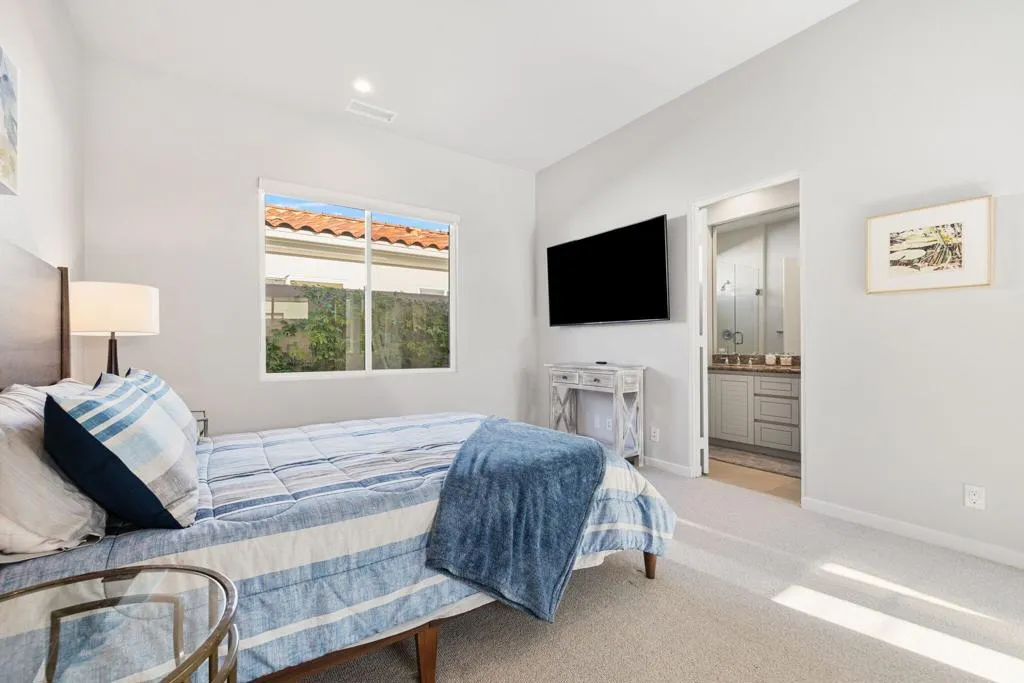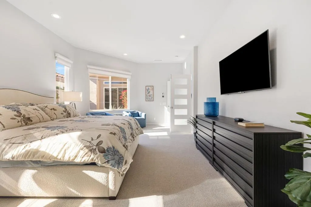 Beautifully remodeled Bougainvillea 2 with unforgettable west-facing water, fairway and mountain views! This 3BD/3.5BA, 2,742 sq. ft. home lives like a modern desert retreat - featuring sleek 24x24 Italian quartz tile, wool Berber carpet, fresh paint inside and out, and designer furnishings throughout. The living space feels bright and open with the removal of pony walls and columns, creating a seamless flow between the kitchen, dining, and great room areas. Enjoy a reimagined great room with a new gas fireplace insert, custom stone surround, recessed TV walls, and all-new LED lighting. The kitchen shines with freshly painted cabinetry and new appliances including refrigerator, dishwasher, and wine fridge. Smart-home upgrades include Nest thermostats, Lockly camera door lock, smart TVs, and new blinds with blackout in the primary. Outdoors, relax under the 17-ft remote-control awning, entertain with natural gas hookups for fire table & BBQ, and enjoy refreshed landscaping and gorgeous golf course views. Turnkey, stylish, and sitting on Arroyo #16 - this home delivers the ultimate Indian Ridge lifestyle. Sold furnished. Club Membership available.