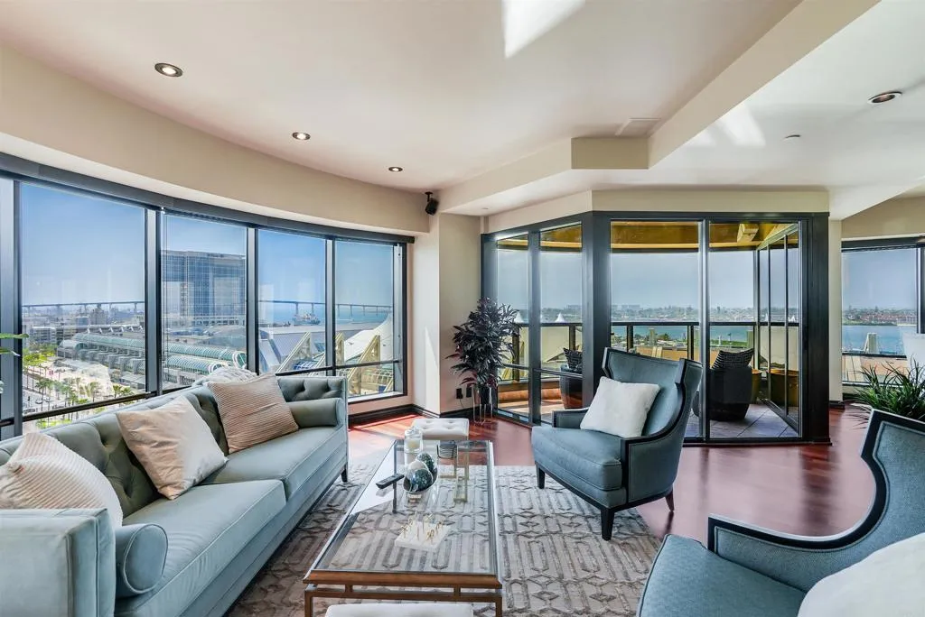 This beautifully furnished 2,510 sq. ft. condo, known as The Bubble, offers an extraordinary living experience in one of San Diego's most iconic luxury buildings. The expansive floor plan includes two elegant living rooms, a bar, and abundant entertainment space, all framed by floor-to-ceiling windows that provide stunning 300-degree views of San Diego Bay, Coronado, Point Loma, and the Downtown skyline. The master suite is a true retreat, featuring maple Brazilian hardwood floors, etched glass French doors, marble countertops, and a steam shower. The suite is equipped with an integrated sound system, four televisions, and two AC units, ensuring ultimate comfort. Two spacious balconies provide breathtaking panoramic views of sunrises and sunsets, with exposures to the East, South, and West. Residents enjoy access to one of the finest community decks in San Diego, located on Level 6. This tropical oasis includes a 90-foot lap pool, jacuzzi, fire pits, BBQ areas, and a newly redecorated clubhouse/cabana. Additional amenities include a well-equipped fitness center and sauna. The unit also comes with two private parking spaces conveniently located on Level 4. Located in the highly sought-after Gaslamp Marina District, this property offers unparalleled convenience, with easy access to Seaport Village, the Midway, Embarcadero, Petco Park, and Little Italy. The building features a recently remodeled lobby with elegant marble and wood finishes, along with 24-hour concierge and security services, embodying the epitome of luxury living in San Diego.