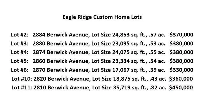 Spectacular setting in the gated community of Eagle Ridge Golf Club. Featuring 9 custom home lots ranging in size from 17,067 sq. ft. to 35,719 sq. ft. Prices range from $330,000 to 450,000. Many of the lots back to wooded open space. Eagle Ridge is a unique neighborhood offering activities for adults and children in addition to various social groups. Most activities are included in the low HOA dues. All lots are a short walk to community amenities including junior Olympic pool, tennis, pickleball and bocce courts, summer concert series at the large park with a playground, barbeque grills and sport court. All near the homeowner clubhouse. Golf leagues for women and men offered as well. There is something for everyone at Eagle Ridge.