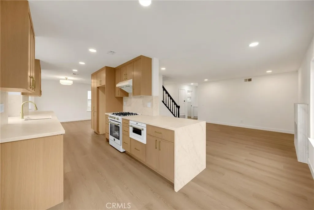 Step into this beautifully redesigned Spanish-contemporary home featuring warm, custom finishes and a cohesive modern aesthetic. The kitchen is fully upgraded with custom slim white oak shaker frameless cabinetry, stone quartz countertops, a high-end White Forno appliance package, and new dual-pane black-frame (white inside) windows that enhance natural light.