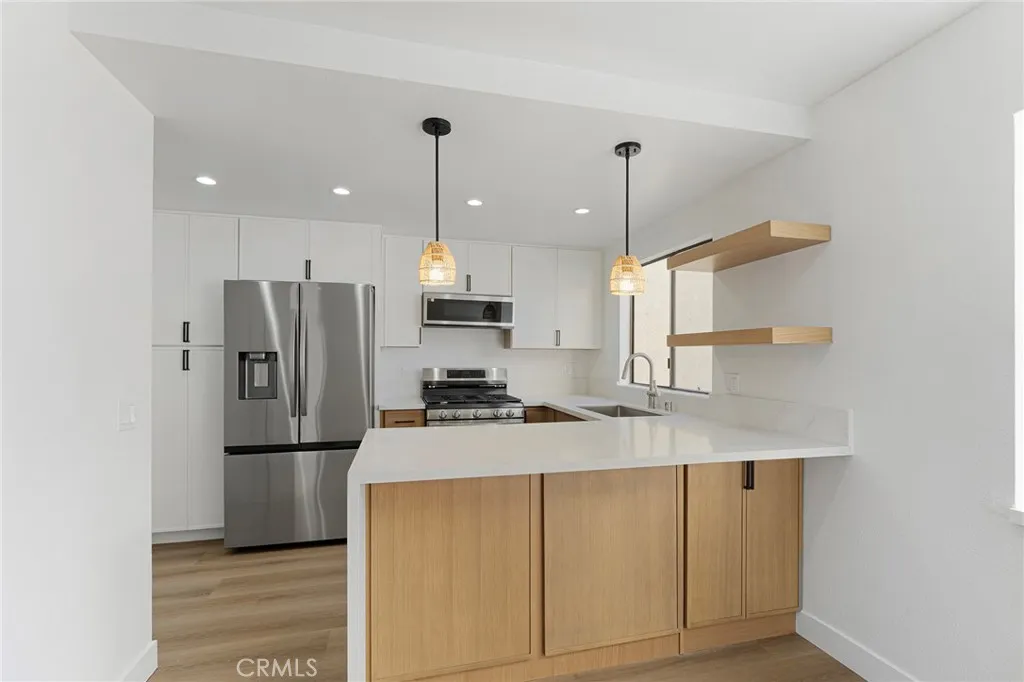 Explore this beautifully residence nestled at the foothills of the San Gabriel Mountains in the charming community of Tujunga. This home features numerous modern enhancements, including fresh flooring that provides a sleek and sophisticated ambiance throughout. The kitchen is particularly impressive, equipped with stainless steel appliances, gorgeous quartz countertops, and stylish slim shaker cabinetry in a warm oak tone. A stunning kitchen peninsula with quartz waterfall counter adds a touch of elegance, making it perfect for culinary enthusiasts. The inviting living room, complete with a charming slatted fireplace, and the spacious primary bedroom both lead to private balconies, ideal for enjoying fresh air and views. Thoughtful recessed lighting brightens up the living room, dining area, and bedrooms, fostering a cozy atmosphere. This residence comprises two generously sized bedrooms and 2.5 bathrooms, ensuring ample space for comfort and convenience. The bathrooms have been elegantly updated with modern surrounds and feature tasteful black and stainless steel fixtures. Additional conveniences include an indoor laundry area and a tandem garage that accommodates two cars, complete with extra storage. With its appealing contemporary finishes, this home exudes warmth and character, inviting you to make it your own. Don’t let this extraordinary opportunity pass you by—claim this remarkable property as your new home!