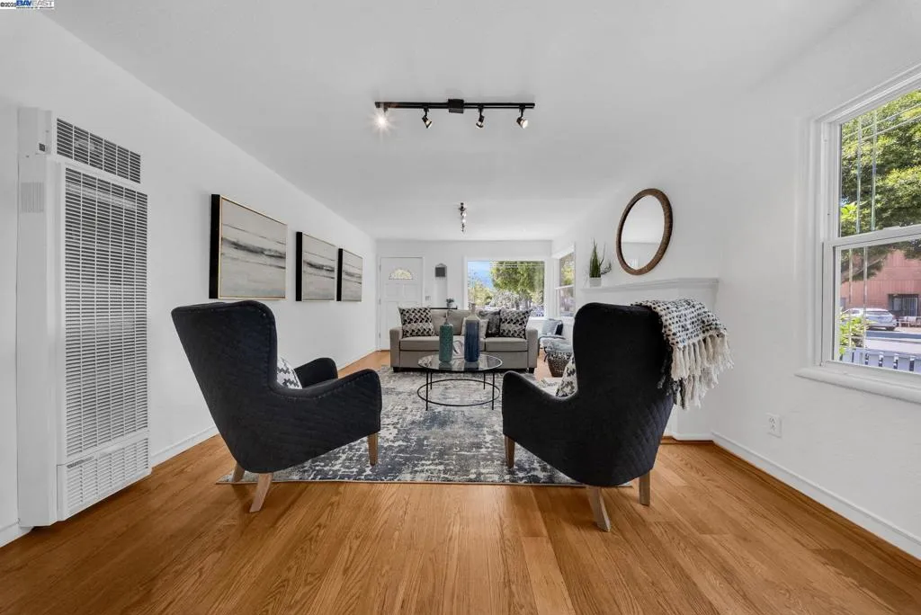 Here’s your second chance to call 205 Julius Street in San Leandro your new home! This delightful, inviting 2-bedroom, 1-bathroom home. With 1,073 sq ft of living space on a spacious 5,390 sq ft corner lot, this detached house offers a unique blend of character and modern amenities. Enclosed by a classic white picket fence, the property exudes a warm, welcoming feel. Step into the inviting living area featuring warm hardwood floors and a charming fireplace. The eat-in kitchen is equipped with stainless steel appliances, including a refrigerator, and a delightful breakfast nook for casual dining. The formal dining room, perfect for hosting, offers ample space for gatherings. The laundry room comes with a washer and dryer, enhancing convenience. Parking is a breeze with included space, and the outdoor area is perfect for relaxation. This lovely home, with its combination of vintage elegance and modern updates, is a rare find in San Leandro.