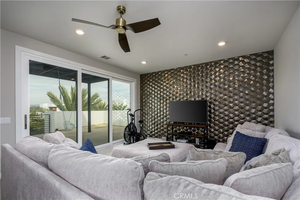 Discover elevated modern living in this exceptional former model home in the highly sought-after Levity community at Tustin Legacy. Built in 2018 by Lennar, this rare tri-level residence offers the largest floor plan in the community, featuring 4 bedrooms, 4 bathrooms, and approximately 3,038 square feet of thoughtfully upgraded living space. Originally selected as the builder’s showcase home, this residence stands apart with curated upgrades, premium finishes, and a level of design detail not typically found in standard units. The expansive layout includes three ensuite bedrooms, providing ideal flexibility for multi-generational living, guests, or multiple work-from-home spaces. Abundant natural light highlights clean architectural lines and creates a bright, open feel throughout. The main living level features an expansive open-concept great room that flows seamlessly into a gourmet kitchen, complete with solid-surface countertops, an oversized center island, custom backsplash accents, and stainless steel appliances—perfect for both everyday living and entertaining. A defining feature of this home is its scale and versatility, offering multiple distinct living areas, including a spacious top-level bonus room with built-in cabinetry and custom modern wall accents—ideal as a media room, lounge, or secondary living space. Multiple patios, including one off the main level, extend the living space outdoors for added functionality and enjoyment. The primary suite, conveniently located on the main level, offers a private retreat with expansive windows, dual walk-in closets, and a spa-inspired bathroom. Additional features include upgraded flooring, recessed lighting, modern window treatments, central HVAC, and an attached two-car garage. Residents enjoy resort-style amenities including a pool, spa, BBQ area, and close proximity to Victory Park. Ideally located within walking distance to The District at Tustin, Whole Foods, dining, shopping, entertainment, and the local Farmers Market, with easy access to major freeways and John Wayne Airport. Top-rated schools, including Legacy Magnet Academy, further enhance the appeal. With its former model home status, rare 4-bedroom/4-bathroom layout, multiple ensuite bedrooms, expansive square footage, and the largest floor plan in Levity, 413 Transport offers a unique blend of size, design, and location that stands apart in today’s market.