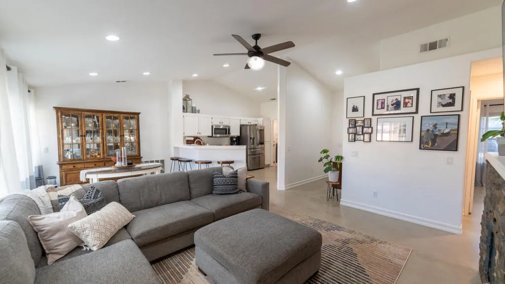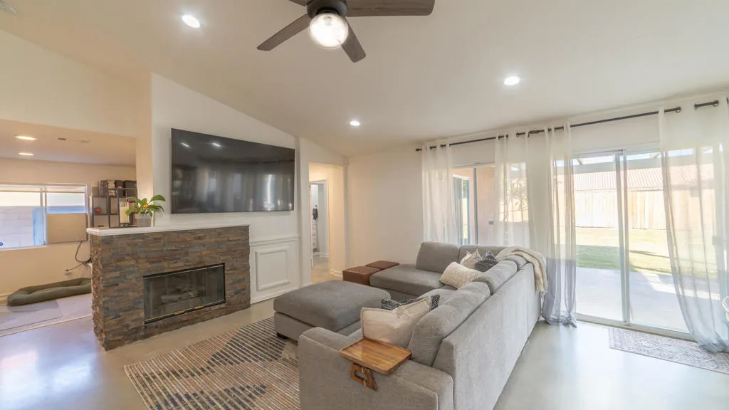 Presenting an exceptional opportunity to own a meticulously maintained home in a prime Palm Desert location, free from HOA fees. This single-story residence exudes curb appeal and features an inviting open-concept floor plan that is ideal for modern living. Comprising two spacious bedrooms, two bathrooms, and a versatile den that can serve as a third bedroom or office, this home is designed with both comfort and functionality in mind. The living area is highlighted by an elegant stack-stone fireplace and expansive windows that provide abundant natural light, complemented by a sliding glass door that offers seamless access to a generously sized covered patio, perfect for outdoor entertaining. The kitchen is bright and well-appointed, featuring stainless steel appliances, a newer microwave, an additional pantry for enhanced storage, and a convenient breakfast counter. The master suite is a tranquil retreat, complete with a walk-in closet and direct access to the backyard patio. Recent enhancements to the property include front yard landscaping, the installation of a mini-split air conditioning unit in the master bedroom, polished concrete flooring and recessed lighting throughout the home and garage. This residence stands as a prime example of updated desert living, combining style, comfort and practicality.The exterior of the property is equally impressive, showcasing beautifully designed desert landscaping, a charming front porch, and a private backyard that offers ample space for the addition of a pool. The attached garage is a standout feature, providing extensive storage options and a dedicated workbench.Please reach out to discuss this remarkable property further.