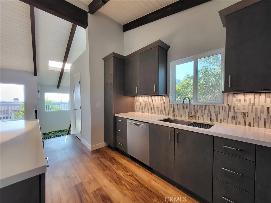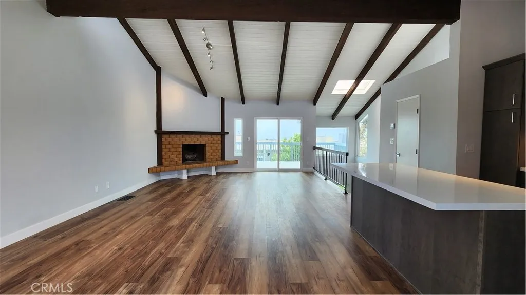 Hermosa Beach Townhome- Only 2.5 short blocks to the beach! Located West of PCH around the corner from the Hermosa Valley Greenbelt. A formal double-door entry leads to all levels. Downstairs you will find 2 guest bedrooms with shared full-size bath and plenty of storage in the hall closet. Halfway up to the top floor is a private & spacious primary bedroom en-suite with its own balcony, walk-in closet (with hidden loft access), remodeled bathroom with dual sinks, and dual shower with soaking tub. Upstairs you’ll find open living areas with vaulted beamed ceilings, remodeled kitchen, guest bathroom, gas fireplace, and access to a large deck with ocean views, room for seating, BBQing, and enjoying the beach life! The open concept kitchen comes offers sleek cabinetry, quartz countertops, S/S Frigidaire appliances, Kraus undermount sink, large island with eat-at breakfast counter, and pantry. Parking is a breeze with an attached 2 Car Garage with laundry hookups, and an additional driveway spot.
