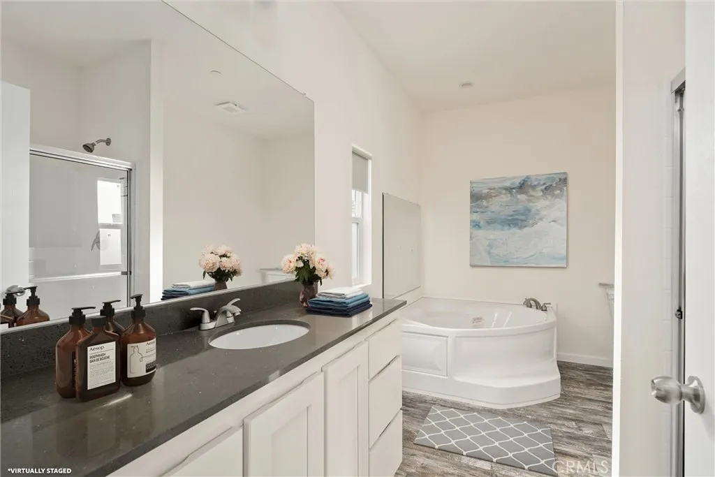 Inside, you’ll find 9’ ceilings, large windows, and an open layout that fills the home with natural light. The upgraded hardwood cabinets, upgraded countertops, and stainless steel appliances create a clean, modern kitchen that flows effortlessly into the main living areas. A gas range makes cooking a pleasure and the laundry room allows for appliance flexibility offering gas and electric hookups.