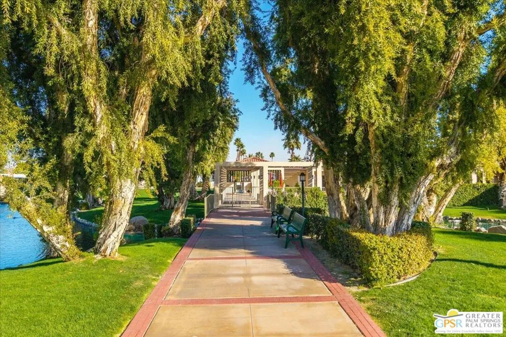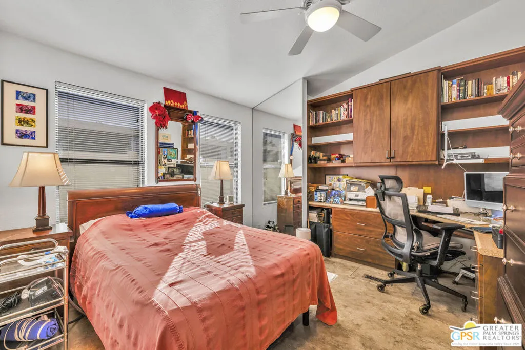 BACK ON THE MARKET: Location + Garage + Solar = A fantastic opportunity at The Canyon, one of the area's most desirable mobile home communities. This spacious 2 Bed / 2 Bath home with a bonus sunroom offers 1,558 sq. ft. of comfortable, well-maintained living space. With drywall throughout, recent updates include: new water heater, garage door, and garage insulation (2024) - new kitchen appliances; gas range, refrigerator, microwave, and dishwasher (2020) - new AC coil and furnace (2021) - new AC/heater mini-split in sunroom, new electrical panel, and patio misting system (2019). From the cozy living room, take in the mountain views and gorgeous desert sunsets. The kitchen features granite tile countertops and custom cabinetry. The large primary bedroom with ensuite bath creates a private retreat within the home. The primary and guest baths both offer granite countertops and custom cabinetry, with the primary bath featuring dual sinks. The bonus sunroom offers versatile possibilities and features a gas fireplace. Energy efficiency is a highlight with 20 leased solar panels installed in 2020 by Sunrun, and a vented evaporative cooler, helping keep energy bills low. Enjoy the convenience of the laundry room adjacent to the attached two-car garage. Outside, the private, fenced backyard includes an electric patio awning and two mature citrus trees. Community amenities at The Canyon include two sparkling heated pools and spas, tennis & pickleball courts, a welcoming clubhouse with library/card room, billiard/game room, fitness room, crafts room, indoor shuffleboard, and a beautiful multi-function room with a stage and professional-style kitchen, ideal for events. This home is conveniently located on a quiet street, just one block away from the clubhouse. The Canyon is a gated, well-maintained 55+ community. Buyers must obtain park approval, which requires a minimum 750 credit score and proof of income three times the monthly space rent of $995. One pet up to 20 lbs is permitted. Buyers and their agents to verify current space rent and square footage. With PSP Airport, shopping, and restaurants just minutes away, this home is perfect for year-round living or as a vacation retreat.