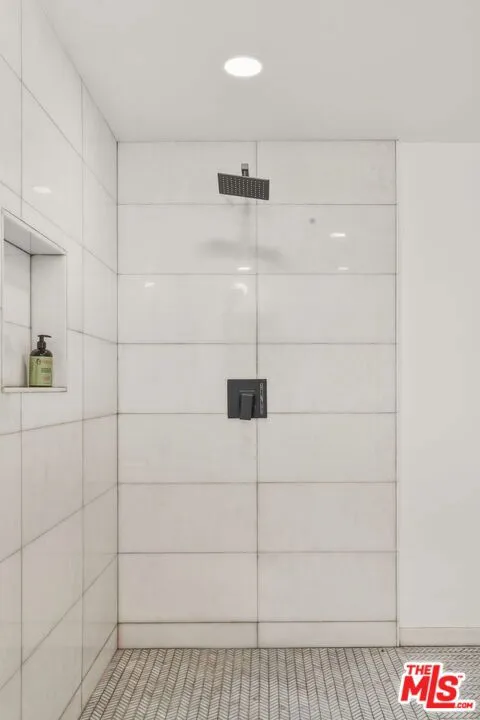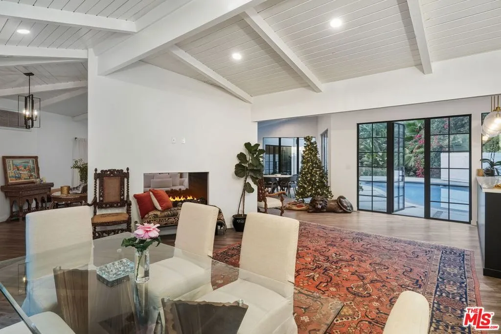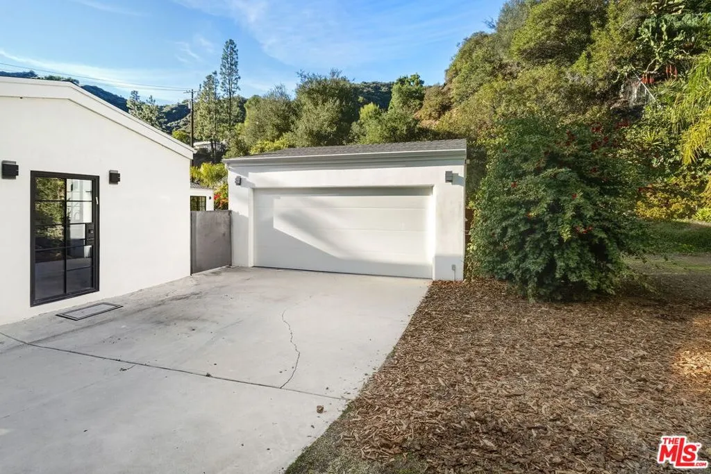 Striking Mid-Century Haven with Expansive Pool, Privacy & Canyon Views. Tucked behind a gated entrance off Upper Mandeville Canyon Road, this striking mid-century residence sits on a lush 12,455-square-foot lot dotted with mature myrtle and pepper trees. Thoughtfully expanded and remodeled, the 2,888 sqft architectural home blends timeless design with dramatic natural surroundings. Inside, ash veneer floors, pitched beam ceilings, skylights, and custom steel-framed windows and doors create a seamless indoor-outdoor experience, reflecting the expansive pool, patios, and serene canyon vistas beyond. The open living, dining, and family spaces offer warmth, flow, and abundant natural light, anchored by a luminous formal entry and double-sided fireplace. The chef's kitchen is a showstopper, wrapped in wide picture windows framing verdant nature and outfitted with stainless steel appliances, a center island, quartz countertops, and generous pantry storage. Ideal for entertaining, the layout connects effortlessly to both interior gathering areas and the outdoor oasis. A private bedroom wing features two guest bedrooms and a beautifully appointed shared bath with double vanity and custom tilework. The luxurious primary suite is a tranquil retreat, boasting clerestory windows, a spa-inspired bath with a freestanding tub and open shower, an oversized walk-in closet, and French steel doors that open directly to the pool. Additional highlights include an oversized two-car garage with 420 sqft of flexible utility space or studio potential, serpentine pavers surrounding the home, and a rare sense of serenity just moments from Brentwood's coveted dining/shopping scene.