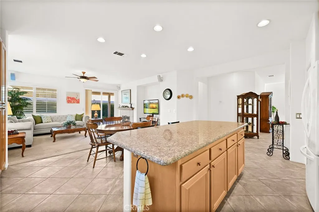 Experience the Messina model in the serene 55 plus Oasis Community. This spacious single-story home offers 2 bedrooms, 2 bathrooms, and a front office within an open layout spanning 1,868 square feet. Inside, you will find beautiful diagonal tile flooring and a well-appointed kitchen featuring granite countertops, a stylish backsplash, and under-cabinet lighting. The kitchen opens to a generous family room that includes a surround sound speaker system, a fireplace, and a slider leading to the backyard with a patio cover and landscaped yard. This model also includes a den that can easily be converted into a third bedroom if needed. The primary bedroom is generously sized and offers a large en suite bathroom with a soaking tub, walk-in shower, and walk-in closet. The oversized two-car garage includes a dedicated golf cart space, which can be used for parking, a workshop, or a hobby area. As a resident of the Oasis Community, you will enjoy access to a wide variety of activities and clubs. The 22,500 square foot clubhouse features a ballroom, exercise facility, billiards room, swimming pool, tennis courts, library, card room, ping pong, shuffleboard, and more. Conveniently located near shopping, dining, and everyday conveniences, this home offers comfort, functionality, and an active lifestyle. Bonus: Low taxes and no Mello Roos.