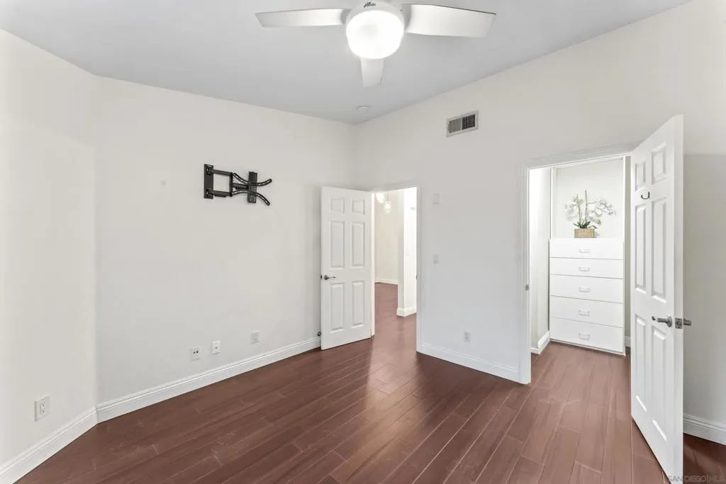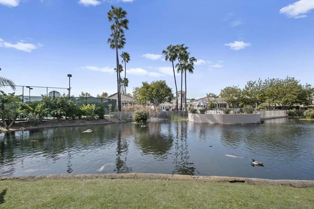 Stunning , sunny premier location, upper-level home welcomes you the moment you step through the door! Nestled in the highly sought-after gated community of Vista Del Lago, this beautifully/recently upgraded and meticulously maintained unit lives bigger than its size with the airy, vaulted ceilings and open space views! Dark Bamboo wood floors flow through the living room, dining area, hallway, & primary bedroom, complementing the custom-designed kitchen featuring new modern flooring and quartz counters, stainless steel sink and appliances. Unique to this unit is the large entry closet and additionally, a pull-down attic offers even more space for storing larger items. Primary walk-in closet has also been extended. Take in lush views from the private balcony. Assigned covered carport is directly in front. This home is a true gem! Schedule a tour today before someone else gets this beautiful move in ready home! Complex now approved for Fanny Mae and conventional lending. Come check out the Bernardo Vista Del Lago resort lifestyle complete with 2 community hot tubs, 3 pools (including 25-meter exercise lap pool), fully equipped exercise gym, pickleball, tennis, recreation room, duck pond and scenic hiking and biking trails. When you're done enjoying all of the community amenities, . Plenty of guest parking spots , as well as EV charging stations for convenience.