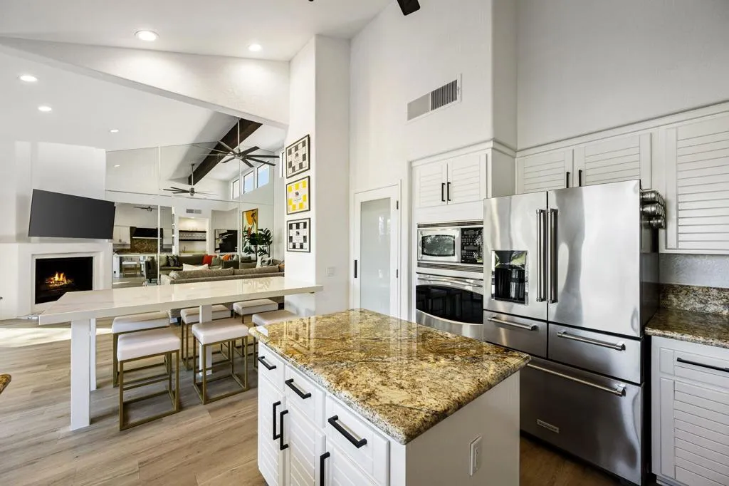 Located on the world-renowned Stadium Course at PGA West, this updated and spacious Legends 10 model offers 4 bedrooms and 3.5 baths across 2,272 square feet of thoughtfully designed living space. Enjoy true VIP seating for The American Express Tournament from your south-facing patio overlooking the 5th green, where you and your guests can relax in the sun and watch the pros up close!The expansive back patio is an entertainer's dream, with panoramic views of both the golf course and the Santa Rosa Mountains, creating a stunning backdrop for gatherings day or night. Two nearby community pools and spas provide effortless resort-style living, giving you easy access to amenities without the burden of maintenance.Inside, abundant natural light showcases the many upgrades throughout the home. Improvements include updated flooring, baseboards, lighting, and ceiling fans, along with a fully enclosed fourth bedroom with closet. The kitchen has been opened to the living room and features a custom built-in quartz-top dining table, perfect for casual dining and entertaining. Additional updates include a new washer and dryer, garbage disposal, and dishwasher.The primary bathroom offers a spa-like retreat with an updated porcelain shower and a personal sauna for ultimate relaxation. This beautifully appointed home is offered fully furnished per inventory and comes move-in ready, complete with a golf cart. Turn-key and ready for your immediate enjoyment, this is truly a must-see property. THIS IS THE ONE!