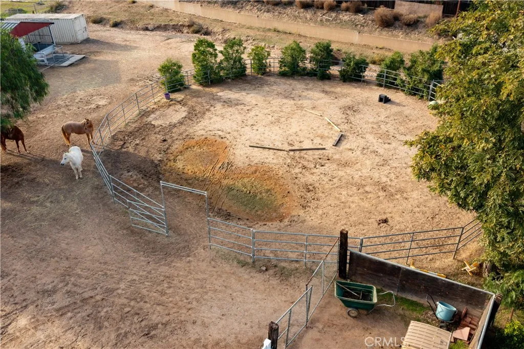 Equestrian amenities include five fully stud wired stalls (four 16’ x 20’, one isolation), with three stalls fully matted and covered; automatic waterers; full LED lighting; and a 120 foot round pen bordered by fern pines. A large California pepper tree stands at the center of the property, creating a beautiful natural shade canopy for horses and riders. The tack room doubles as the feed room and is fully shelved for grooming gear, medicine, and supplies. A horse wash rack, mobile mini storage unit, and open pasture space complete the professional grade setup.