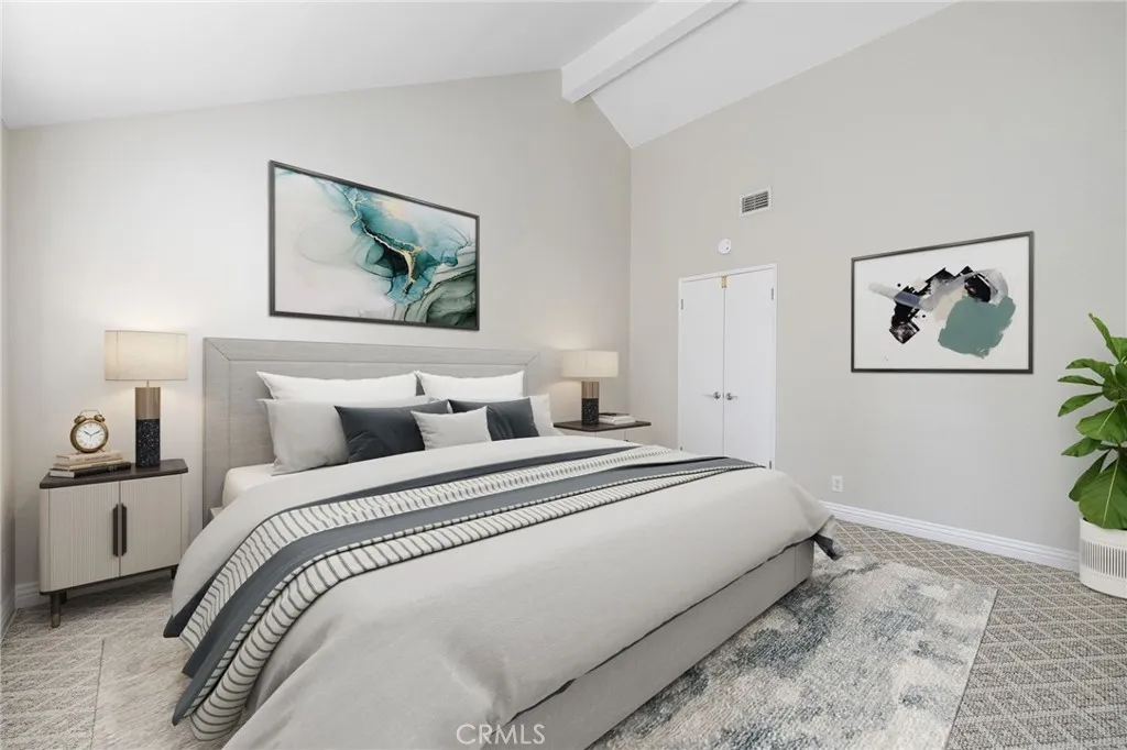 Beautifully Updated Townhome in La Cuesta Encantada. Set within a highly desirable community known for its mature trees, well-kept grounds, and charming architectural design, this townhome offers a fresh, modern interior and a comfortable two-story layout. The front door opens to a spacious family room featuring designer carpeting, recessed LED lighting, a sleek brick fireplace, and plantation-shuttered windows overlooking the landscaped front yard. The kitchen showcases modern gray cabinetry, granite countertops, updated appliances, recessed lighting, and tiled flooring. A generous dining area is open to the kitchen and offers a sliding door to the private patio, while a conveniently placed laundry closet sits just steps away. A main-floor half bath adds practicality for guests. Upstairs, the primary bedroom features double entry doors, vaulted ceilings, designer carpeting, a view window, and two closets. The primary bath includes a vanity with a makeup area and a walk-in shower with a new glass enclosure. The secondary bedroom also offers vaulted ceilings, matching carpet, and a spacious closet, with a full hall bath nearby. The backyard provides a private concrete patio enclosed by stucco walls, with a gate leading directly to the detached two-car garage just steps away. Community amenities include a pool and clubhouse, adding to the overall appeal of this well-located San Dimas residence.