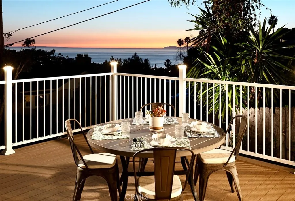 Commanding sweeping canyon vistas and breathtaking ocean views stretching to Catalina Island, this beautifully reimagined Laguna Beach coastal cottage captures the essence of relaxed seaside living. Perched above the trees along a quiet street in sought-after Bluebird Canyon, the home welcomes you through a charming Dutch door into a light-filled living space where warm hardwood floors and a cozy fireplace create an inviting atmosphere. A wall of custom window doors opens wide to an expansive front deck, seamlessly blending indoor and outdoor living while framing stunning sunset views over the Pacific. Designed for entertaining and everyday enjoyment, the oversized deck offers an ideal setting for outdoor dining, lounging, and soaking in panoramic canyon and ocean vistas. The thoughtfully designed chef’s kitchen features custom cabinetry, a farmhouse sink, and a breakfast bar, flowing into the dining area with built-in bench seating and clever storage. Both bedrooms enjoy serene garden and ocean views, while the primary suite includes a stylish en-suite bath. Surrounded by lush landscaping and mature fruit trees, the wrap-around fenced yard offers multiple private outdoor spaces including a tranquil backyard patio and a classic Laguna outdoor shower after a day at the beach. Completely remodeled in 2025, the home combines timeless cottage charm with modern upgrades including new windows and doors, updated plumbing and electrical, hardwood flooring, roof, foundation improvements, and central air conditioning. Ideally located in peaceful Bluebird Canyon just minutes from Laguna’s renowned beaches, hiking trails, village restaurants, and galleries, this special property offers the perfect blend of privacy, views, and coastal lifestyle. A rare opportunity to enjoy sweeping ocean sunsets and quintessential Laguna Beach charm in a beautifully updated canyon retreat.