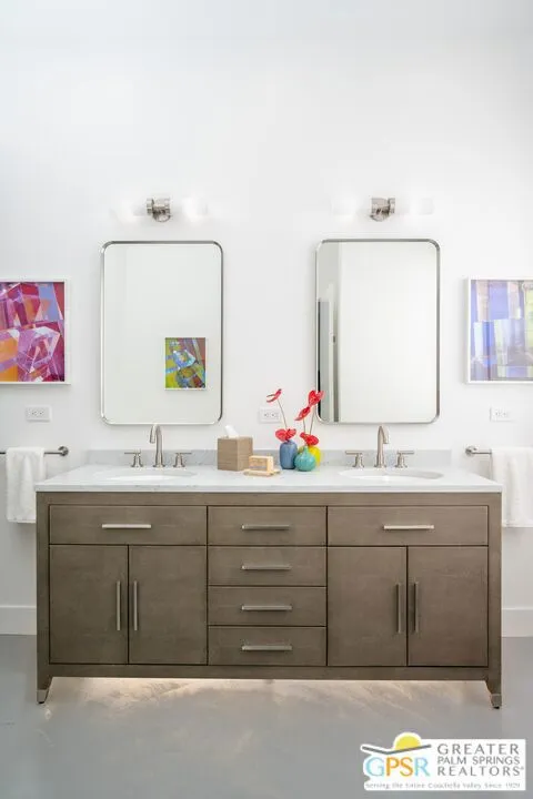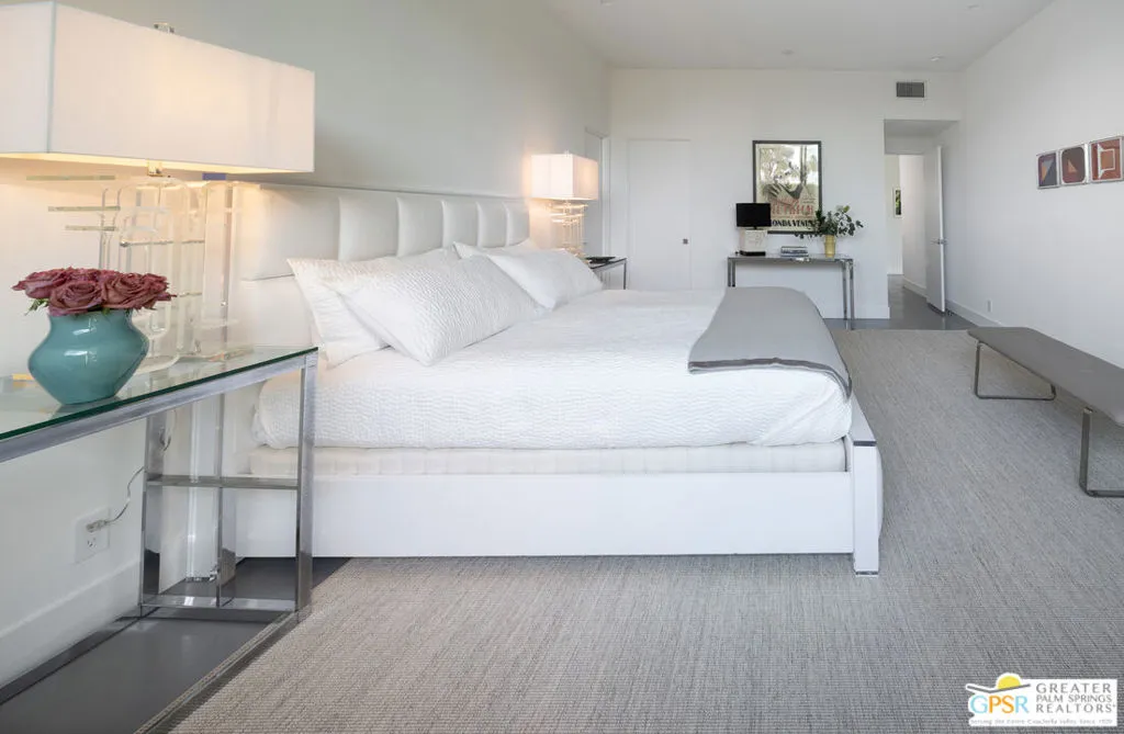 Situated in prestigious Marrakesh Country Club, this John Elgin Woolf designed Hollywood Regency Villa is a pinnacle of modern luxury. Remodeled by renowned celebrity photographer, Firooz Zahedi, author of several books including "My Elizabeth" on Elizabeth Taylor. This three-bedroom, three-bathroom, 2,427 square foot home is the largest of the original floor plans with the remodel completed in October 2025. Enter through the west-facing courtyard beautified with new hardscape and soft, lush landscaping scaling the exterior walls. Through iconic Marrakesh double doors lies a stunning, high-end modern renovation representative of a caliber that is higher than standard. The tall ceilings, extremely smooth white walls, new modern sliders and modern shades enhance light and set the mood throughout the home. In the living room, the black marbled fireplace, recessed art lighting and electric dual sun/blackout shades allow for the manipulation of light to your choice of ambience. Large new sliders frame stunning mountain views and the enormous green space behind. The expanded kitchen footprint allows for modern living with stainless steel appliances, gas cooking, modern gloss cabinetry, wine refrigerator and ample counter space. All bedrooms have private, en-suite baths with Restoration Hardware vanities in all baths. The primary bedroom includes a spacious bathroom with standalone tub, separate marble shower, new vanities, plumbing and fixtures. The walk-in closet includes custom shelving and organizers, and built-in laundry basket and wall storage. The secondary bedroom suite have been expanded to include a separate seating or office area, built-in closets and en-suite bathroom with shower. The third bedroom also includes an en-suite bathroom with shower and access to the front courtyard. Stackable laundry is hidden with convenient shelving and separate wash basin. Additional features include: a tankless water heater, two newly installed HVAC systems, two-car garage with EV Charging port, new electrical subpanel, new sliders/windows and a 38 panel/11.21kW solar system. Marrakesh is a boutique country club with an ideal central valley location amongst a few of the desert's finest private clubs. Amenities include 18-hole private executive golf course, tennis, pickleball, 14 pools and spa, a fitness center, and an active and newly-remodeled clubhouse with fine dining. Marrakesh is near famous El Paseo with all of its elegant boutiques, restaurants, art galleries, and coffee houses. Come experience Marrakesh Country Club. Furniture and Art available outside of escrow separate from the listing price.