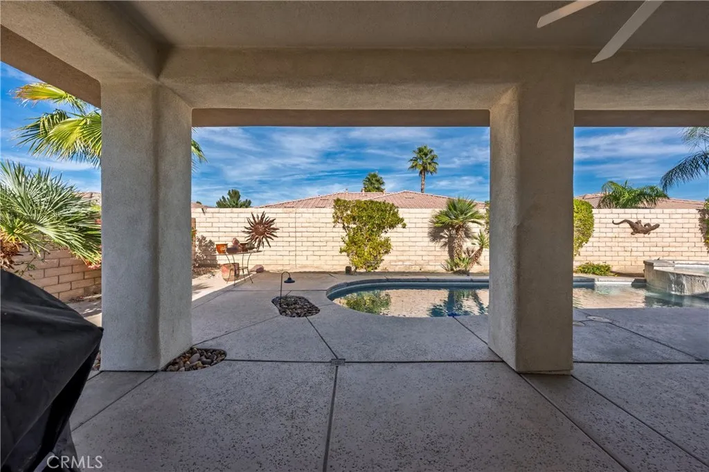 Lowest priced private pool home in the wonderful, gated community of Tuscany. Enjoy views of the San Jacinto mountain peak from your rear yard and private pool, spa, and firepit. You can even see the light at the top of the tram at night. This community boasts exceptional space, landscaping, a gated entry, dog park, playground, and stunning water fountain. The community pool and hot tub with bathrooms and BBQ equipment are across the street. The home has a practical floor plan with 3 bedrooms, 2 bathrooms and an additional flex room that would make a stately home office or den. Enjoy the surround sound speaker system, air conditioning, and convenient single level living. Also, this property was just retrofitted with all those items that insurance companies are looking for like water flow, temperature and smoke detector monitoring, a tremendous help in getting new insurance. Affordable Coachella Valley living in a fantastic community near everything that makes the Palm Springs area so desirable.