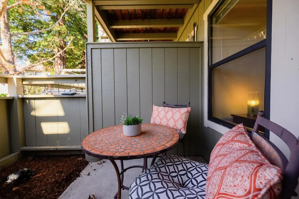 Enjoy the convenient lifestyle of the Hidden Oaks community, featuring multiple pools, spas, & well-maintained greenbelt areas. This home is located within close walking distance to markets, restaurants, theaters, the Community Center, library, Skypark, transit center, & other Scotts Valley amenities.The light-filled living room offers vaulted ceilings, a fireplace, and peaceful greenbelt views. The desirable reverse floor plan places both bedrooms on the ground level, with the kitchen, dining area, and living room on the upper level. The Kitchen is tastefully appointed with plenty of beautiful Oak cabinetry, sunny garden window, pantry, new stainless-steel Oven/Stove, Dishwasher, & Refrigerator. A second-floor balcony provides a comfortable outdoor dining space overlooking one of the community spa and greenbelt areas. The primary bedroom includes a private patio, vanity area, & full en-suite access. Interior improvements include new paint, new flooring, & various updates throughout. You'll love the effortless access to grocery stores, the transit center, parks, dining, & more. With Highway 17 just moments away, you're minutes to the beach or an easy commute into Silicon Valley, plus award-winning schools!
