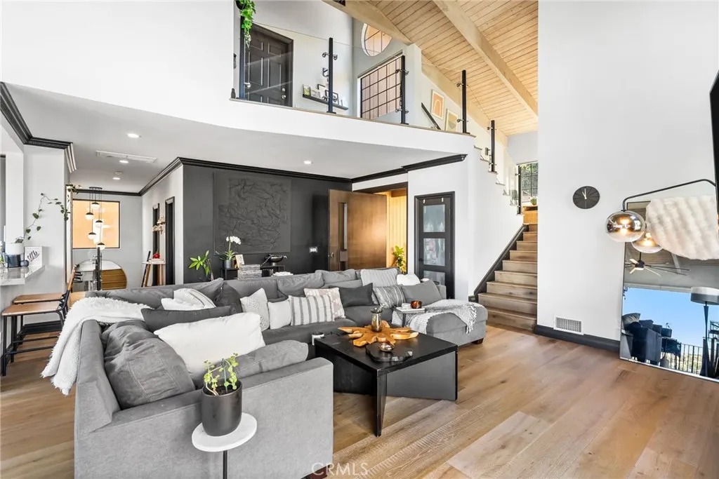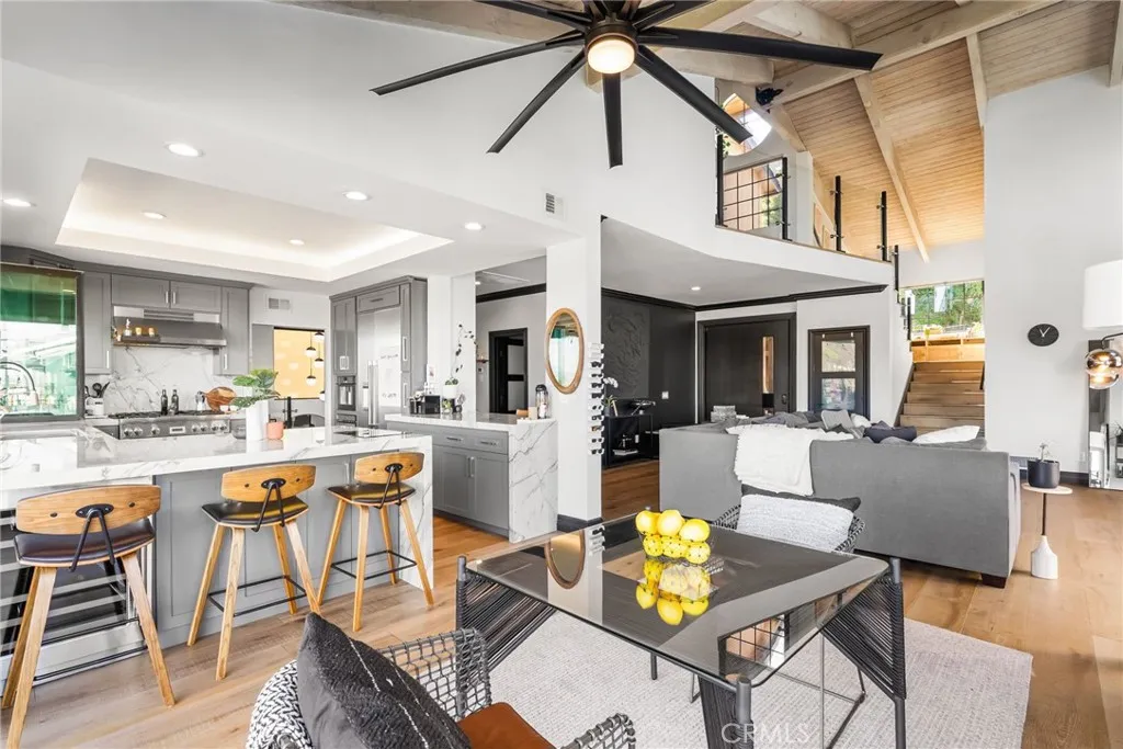 Perched in the hills of North Tustin, this beautifully reimagined home pairs a modern, high-end aesthetic with the charm of a quiet, established neighborhood known for its peaceful hillside setting. 12348 Circula Panorama showcases sweeping views of city lights and surrounding mountains, framed by dramatic architecture, soaring ceilings, and expansive glass that fills every room with natural light. A striking pivoting front door sets the tone, opening to an airy interior defined by clean lines, contemporary finishes, and floor-to-ceiling windows that seamlessly blend indoor and outdoor living. Thoughtfully placed Marvin sliders and generous balconies invite you to enjoy panoramic vistas from nearly every angle, creating an ambiance reminiscent of a private retreat. The main level centers around a fully redesigned chef’s kitchen featuring premium stainless-steel Thermador appliances—including a wine refrigerator and microwave drawer—sleek custom cabinetry, a built-in espresso station ideal for morning rituals or entertaining, and extensive quartz waterfall countertops. The kitchen opens to an informal dining area and a warm, inviting great room anchored by a fireplace, with a formal dining room, currently used as a creative space, located just off the kitchen. White-oak engineered wood flooring enhances the home throughout. Spanning approximately 3,200 square feet on nearly half an acre, the property embraces indoor-outdoor living with multiple terraces and a gently sloping lot offering potential for a custom deck, garden terrace, or additional outdoor entertainment areas. Designed with comfort and flexibility in mind, the floor plan includes a convenient main-floor bedroom and a remodeled main-floor bathroom. The lower level features three additional bedrooms and a remodeled bathroom—ideal for guests, multigenerational living, office use, or creative workspaces—while the privately situated primary suite occupies the top floor, maximizing both privacy and elevated views. With each level opening directly to its own balcony, the home offers effortless opportunities for al fresco dining, relaxation, and entertaining against a stunning natural backdrop, blending modern luxury with timeless tranquility in the heart of North Tustin.