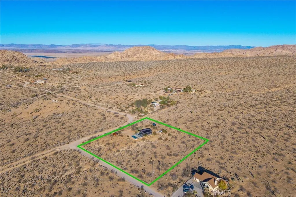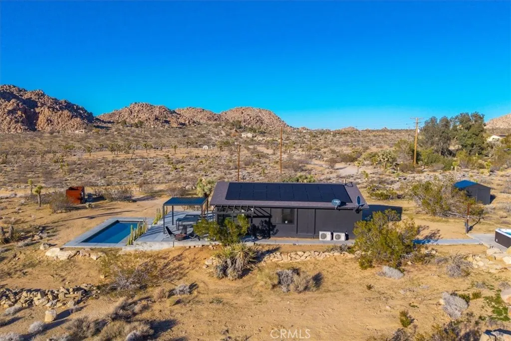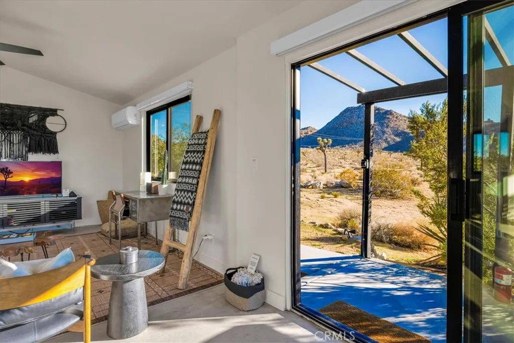 A rare opportunity to own a stunning desert retreat with POOL AND SPA in the coveted Quail Springs area of Joshua Tree—just minutes from the park entrance, and with a backyard that directly borders Joshua Tree National Park itself. This remodeled 1 bedroom, 1 bath home blends sleek modern finishes with the raw beauty of its extraordinary setting, and is nestled on a roomy 2.5 acre parcel. The massive open-concept living area features polished concrete floors, soaring ceilings with exposed beams and ceiling fans, and expansive windows—including two sets of sliding glass doors that open to the patio—bringing panoramic National Park views into every corner of the home. The dining area includes built-in bench seating and continues into the beautifully updated kitchen with butcher block countertops, stainless steel appliances, and a deep farm-style sink. The bedroom is comfortably sized and includes its own mini-split and ceiling fan. The spacious bathroom feels spa-like with dual sinks, tiled floors, a large walk-in glass shower, and a separate soaking tub—perfect for unwinding after a day of hiking or stargazing. Outside, the magic of the desert comes alive. A wide concrete patio offers shaded seating under elegant pergolas and a built-in barbecue area. A private in-ground pool overlooks the National Park’s dramatic boulder-strewn vistas, while a secluded hot tub sits down a quiet concrete path for total relaxation beneath the stars. Homes like this—backing directly onto Joshua Tree National Park—are exceptionally rare. Here, you can live immersed in the landscape that draws visitors from around the world, with the park quite literally in your backyard. Book a showing to see this incredible gem for yourself!