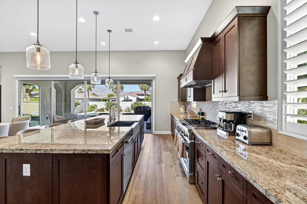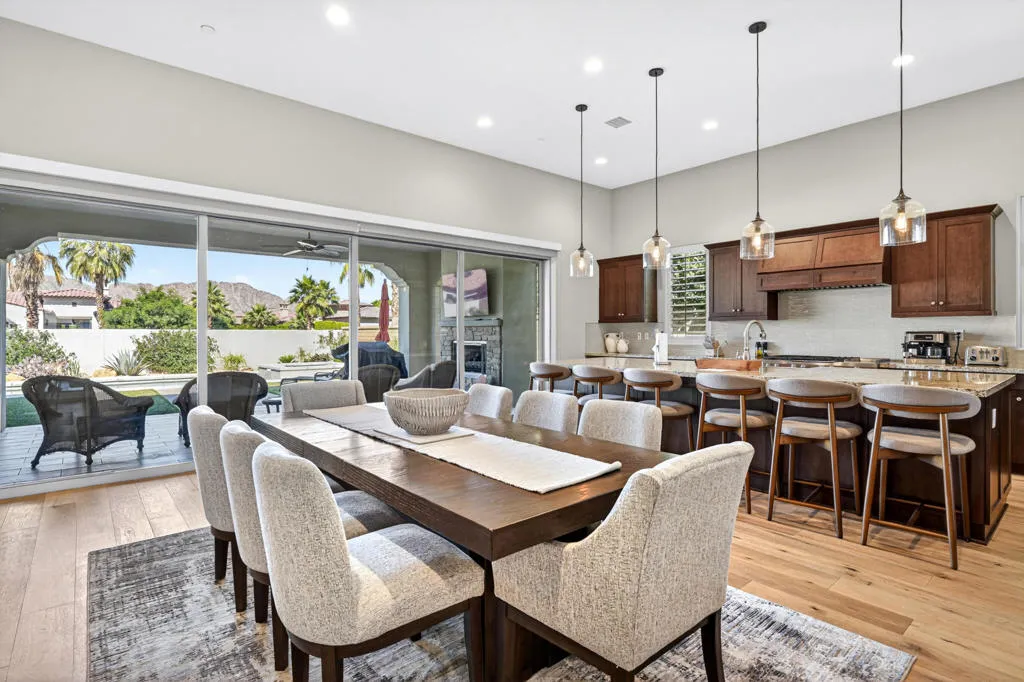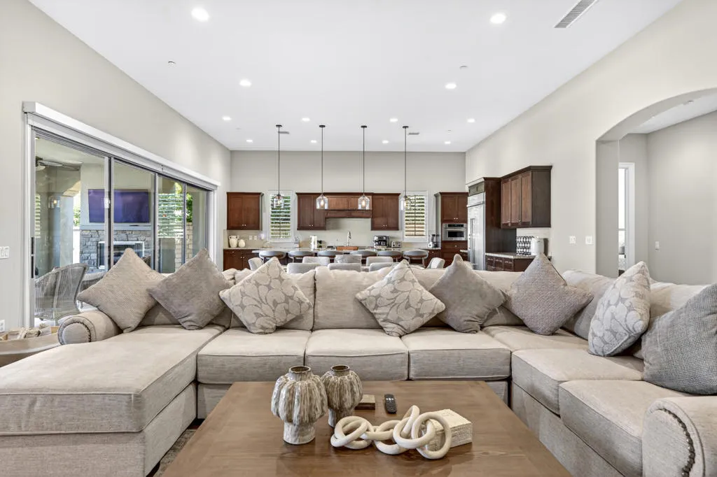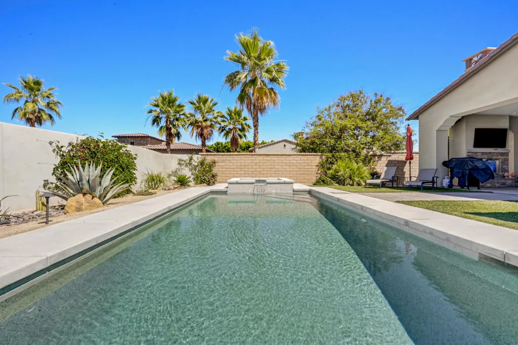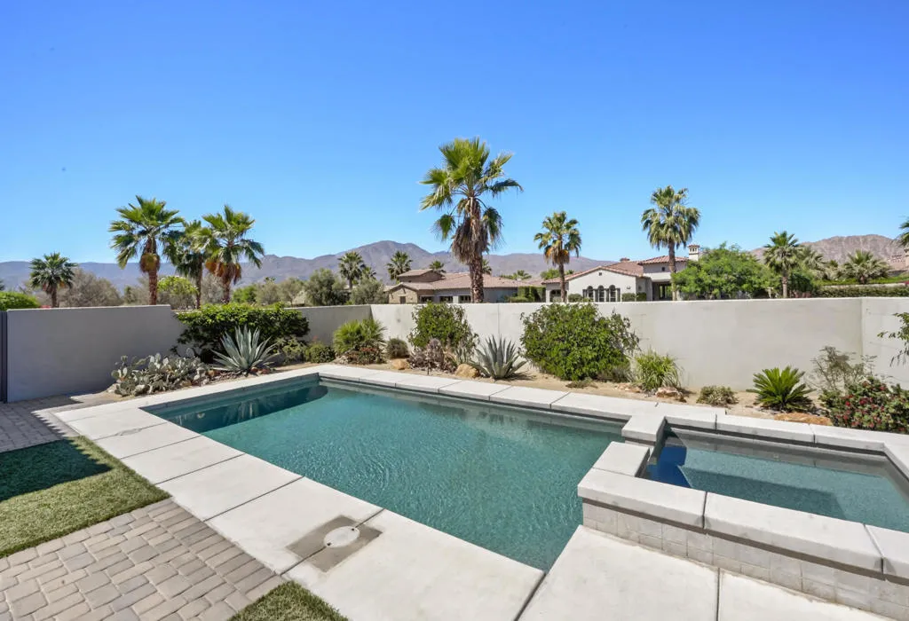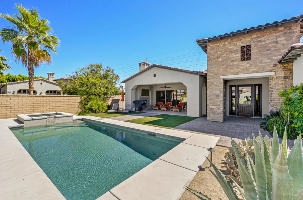 Discover elevated desert living in this exceptional 2019-built residence offering approximately 3,180 square feet of refined living space on a generous 10,890 square foot lot, located inside the coveted Greg Norman Gate of PGA West. Thoughtfully crafted with sophisticated finishes throughout, the home showcases a chef's kitchen, honey-honed wood flooring, and a flowing, open layout designed for effortless entertaining. Each of the four spacious bedrooms features its own private en-suite, while the primary retreat delivers a true spa-like sanctuary. Expansive sliding glass doors form the heart of the home, seamlessly blending interior comfort with the stunning desert surroundings. Step outside to a resort-style oasis highlighted by sweeping mountain panoramas, vibrant sunset views, and an inviting patio complete with a fireplace, TV, and luxurious seating--ideal for relaxing or hosting guests. Turnkey and impeccably furnished, this residence is perfectly positioned just minutes from world-class golf, Old Town La Quinta's dining and shopping, and the iconic Coachella and Stagecoach festival grounds.