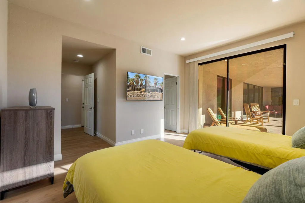 An exceptional South Palm Desert residence, fully reimagined through a complete down-to-the-studs renovation in 2021, offering refined desert living with modern systems, thoughtful design, and owned solar--all in a desirable non-HOA setting. This south-facing home was entirely rebuilt to today's standards, including new interior walls, ceilings, flooring, roof, fireplace, appliances, hot water heaters, and a new garage door and opener, resulting in a property that lives with the ease and confidence of newer construction. Expansive living spaces are filled with natural light and defined by soaring ceilings and exposed beams, creating a sense of volume and architectural interest. The custom kitchen serves as the centerpiece of the home, featuring a large granite island with seating, a commercial-style gas range, and seamless flow to the surrounding entertaining areas. A built-in wet bar with beverage and wine coolers enhances both daily living and hosting. Outdoors, the private backyard offers a resort-style experience with a striking glass-tile pool and spa, expansive imported travertine decking, and a gazebo perfectly positioned to enjoy mountain vistas and dramatic desert sunsets. The primary suite is a true retreat with direct access to the backyard and a spa-inspired ensuite bath complete with a standalone soaking tub and walk-in closet. Two additional guest suites each feature their own ensuite baths, providing comfort and privacy for guests or extended stays. Porcelain tile flooring runs throughout the home for a clean, cohesive aesthetic and easy maintenance. Owned solar, installed in late 2021, delivers outstanding energy efficiency and meaningful long-term savings. Surrounded by low-maintenance desert landscaping and ideally located near El Paseo's renowned shopping, dining, golf, and hiking, this home offers a rare blend of luxury, privacy, and modern desert sophistication.