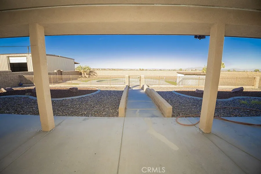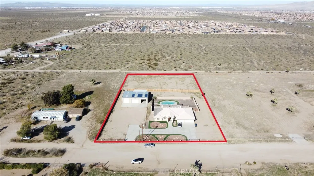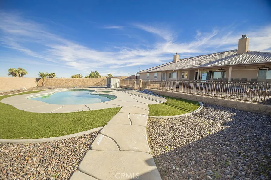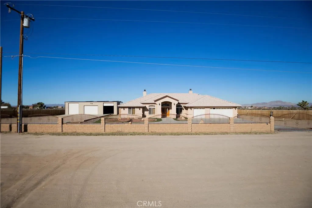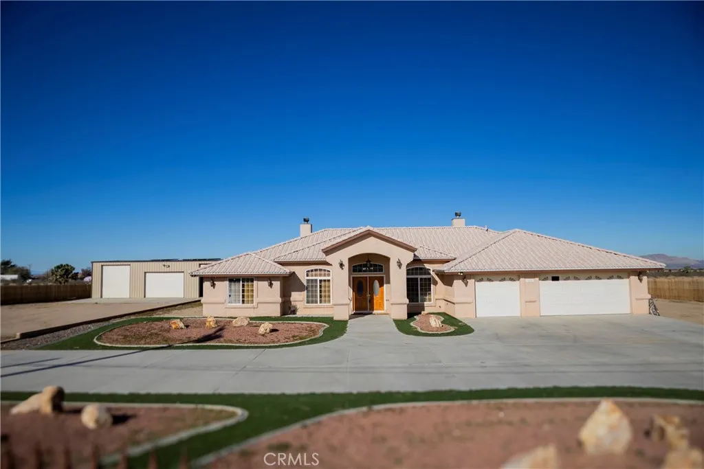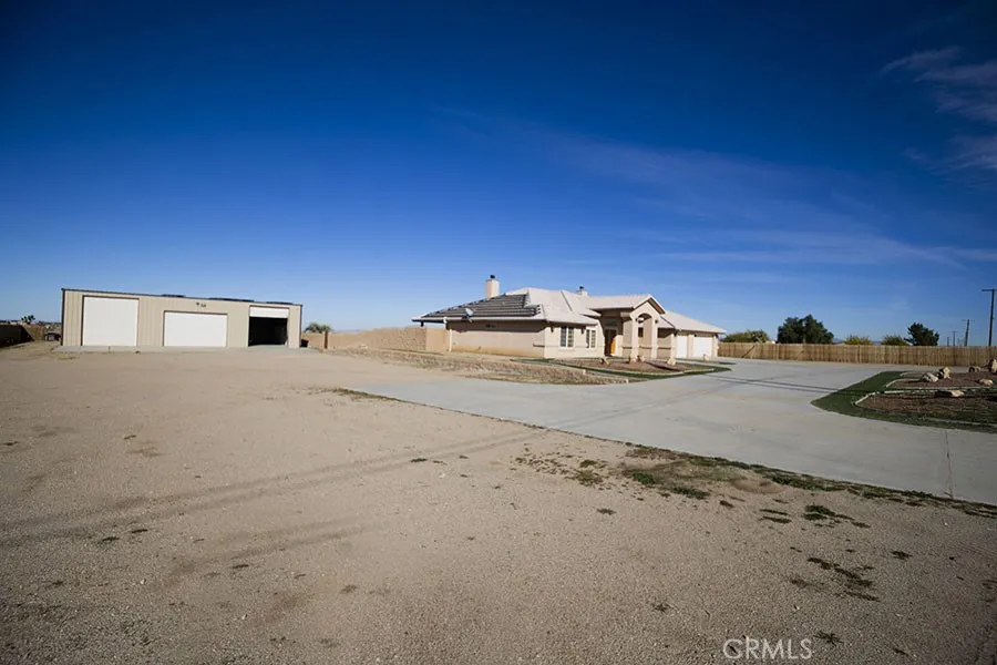 The one and only property that has it all inside and out. Large open floorplan 3 bed 2 bath single story, flat acreage with a 3 car attached garage, paid solar, large 2500 sf steel garage that can fit 40+ ft long RV, pool and jacuzzi...this home HAS IT ALL. Custom built in 2006 with 2x6 framing high energy efficient insulation, truss-over patio entertainment area, this home boasts 2 large wood burning fireplaces with one in the living room and one in the master bedroom. The kitchen is open with a large center island, large walk-in pantry, trash compactor, double oven, and great room layout to the living room and nook. The larger master bedroom has views to the north and a connected oversized master bathroom complete with jacuzzi tub, large walk-in shower, and walk-in closet. To the outside you will find its own oasis, complete with covered patio area with a view, also including a custom bbq island, gated pool/jacuzzi, all enclosed by custom block and wrought iron walls and fences. Landscaping on the entire property, all lawn areas are high-end waterless turf. You will not find another property quite like this.