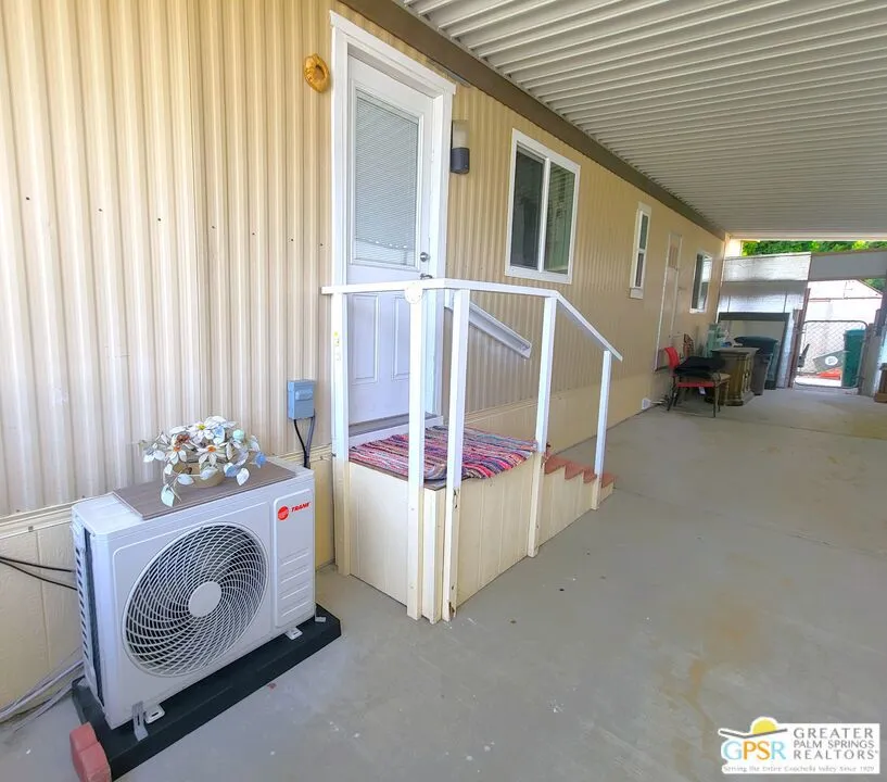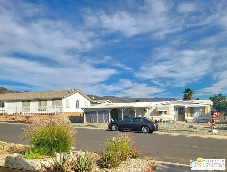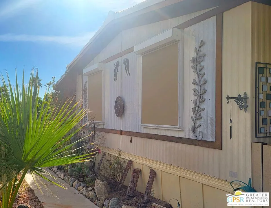 Settled within the very lively golf community of Desert Crest Country Club in a beautiful rural setting, this one of a kind Two Bedroom / Two Bath, REMODELED manufactured home that was built in 1979 offers a unique blend of comfort and convenience tailored for those seeking an active and vibrant 55+ lifestyle. Located in the North End of Desert Crest Country Club yet just around the corner from the huge Clubhouse, natural mineral spring water Pool & several Spas, and golf facilities that are free to the Owners, this home enjoys the perks of a lively existence, surrounded by the scenic beauty of the desert landscape in the Western Coachella Valley. The Desert Crest Country Club community boasts a 9-hole golf course, inviting residents to enjoy leisurely rounds amid the picturesque setting of pond and mature trees that boast views of Mounts San Jacinto and San Gorgonio and the iconic windmills of the Banning Pass. This oasis extends beyond the golf course, offering a multitude of amenities enhancing your daily life. Residents here enjoy a multi-faceted Clubhouse featuring a healthy mineral water Pool and Spas, providing a serene escape and a hub for plenty of social connections. Indoor Shuffleboard and other activities are a welcome diversion here at the Clubhouse, with many interior facilities to keep you moving. The onsite cafe caters to culinary cravings, the dog groomers attend to furry companions, and the real estate office ensures all needs are met with ease. These conveniences foster not just a residence but a sense of belonging within a home and community bound by shared experiences and vibrant camaraderie. This well-maintained home reveals some very private outdoor spaces, from the covered Southside Patio to the very private Rear Yard that is surrounded by 20 foot trees, giving you a true oasis. You come into an interior that includes new laminate flooring throughout. Two Bedrooms and two fully remodeled Baths offer both comfort and functionality, catering to the needs of daily living within the spacious interior. The Primary Bedroom stands as a serene haven, complete with a full-sized Closet. The ensuite Bath has been remodeled with a huge step-in Shower. Of special note are the NEW appliances in the open Kitchen, including a master sized modern Banquet Refrigerator. An extra Bonus enclosed Patio Room has easy access to the rest of the Home. You even have a large Shed tucked away to the rear of the property to handle your storage needs. Of special note are the many efficient heating and cooling additions to the Home, including two Split A/C's wall Units, and the Central HV/AC. The covered South patio makes an inviting space designed for relaxation and entertainment. The Rear Yard is an oasis of calm and serenity, and is a great place to enjoy all day. It's the ideal spot to revel in the beauty of the desert evenings, fostering moments of tranquility and social gatherings. The low-maintenance landscaping, fenced for privacy, ensures that upkeep remains effortless, allowing residents to focus on the joys of community living. The Carport is decidedly spacious enough for two vehicles and a Golf Cart. This home represents a harmonious blend of comfort, style, and functionality, creating a delightfully private haven within the heart of Desert Crest Country Club. Whether indulging in a round of golf, luxuriating in the mineral water pool, or simply savoring the serenity of the surroundings from your very private rear deck, this property offers a unique and fulfilling 55+ living experience, where every moment resonates with the essence of a life well-lived.