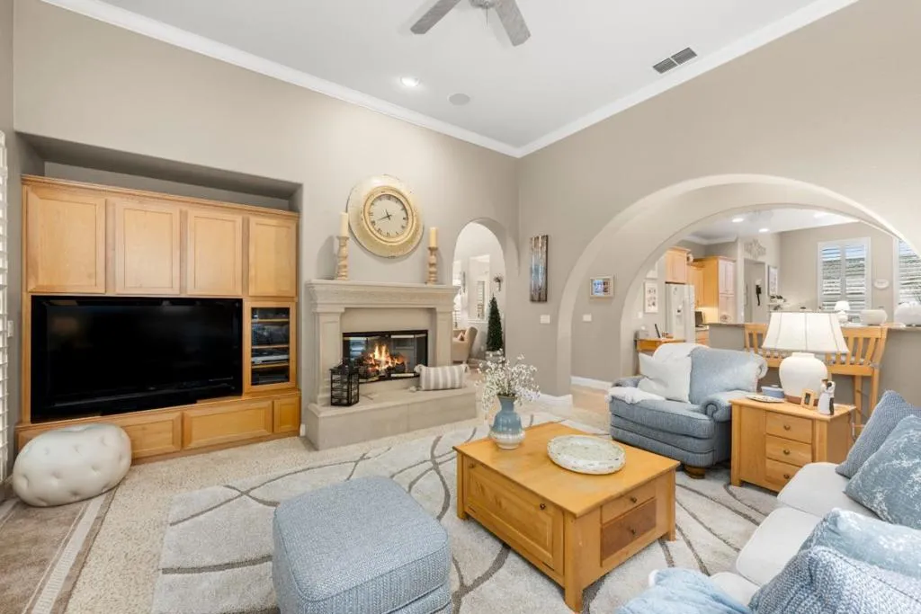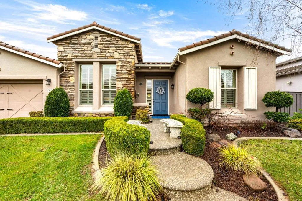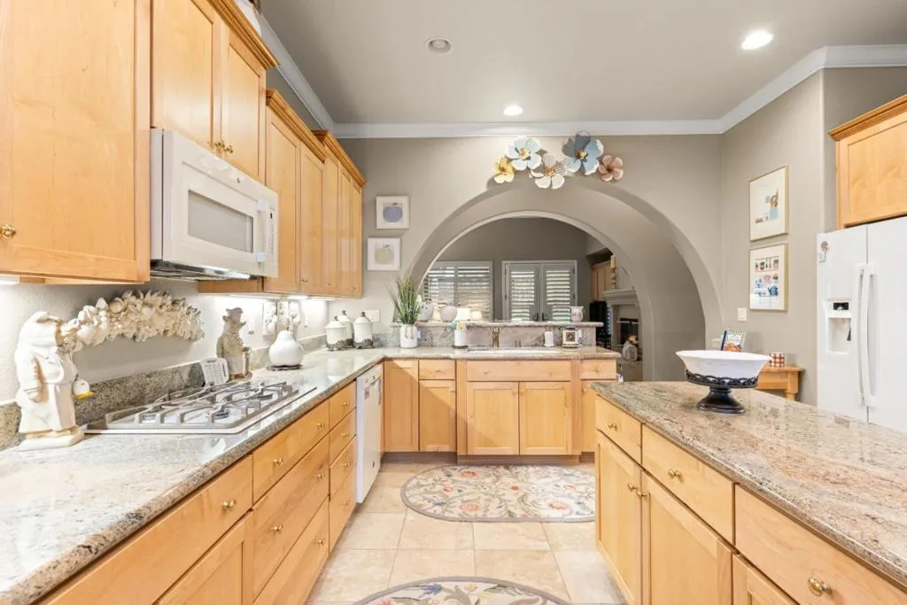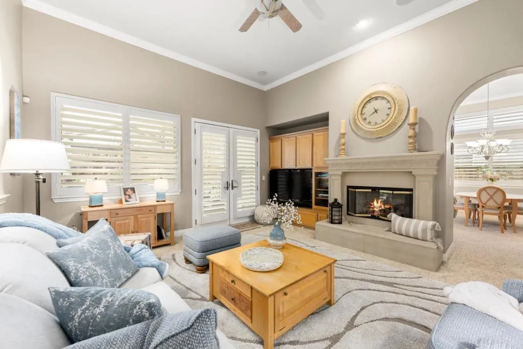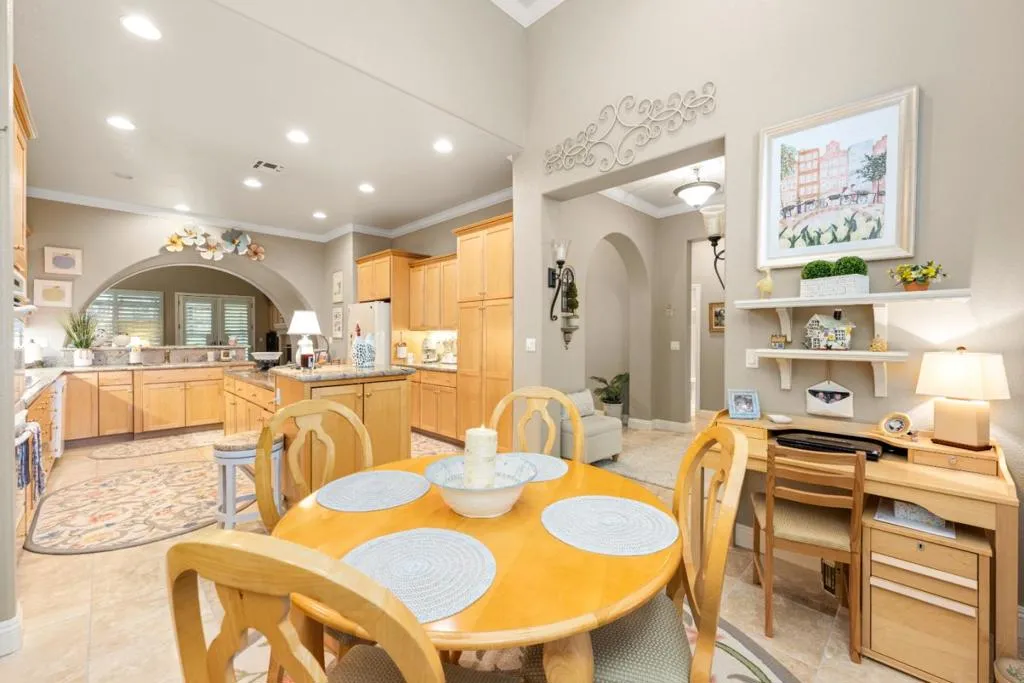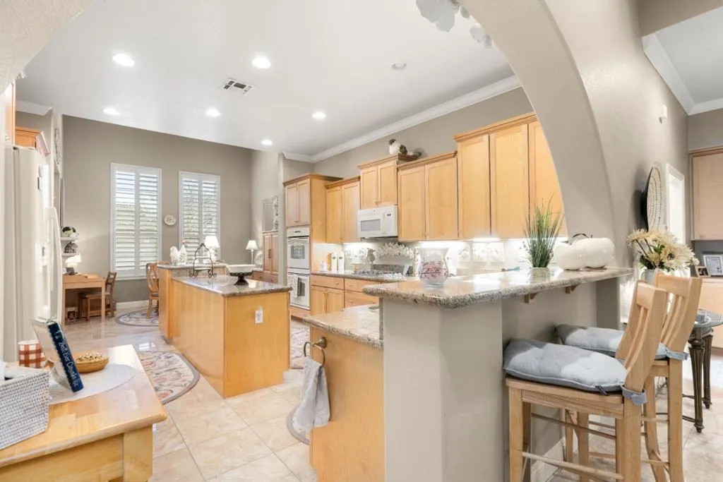 Set in the sought-after Heritage Park 55+ community, this Pacifica model welcomes you with a timeless stone-accent elevation, designer entry, and manicured landscaping that instantly feels done right. Inside, natural light pours through wide plantation shutters and tall windows, highlighting crown molding throughout, 4-inch baseboards, and elegant travertine flooring that carries the home with a clean, upscale finish. The heart of the home is the spacious kitchen, rich natural maple cabinetry, granite countertops, a large center island, and coordinated bisque appliances including double ovens. The layout flows into the comfortable family room with a cozy fireplace, while French doors off the family room, living room, and primary suite create seamless indoor-outdoor living. Step outside to a private, low-maintenance retreat featuring turf lawn, a tranquil waterfall and pond, a large equipment shed, and a built-in barbecue; ideal for relaxing afternoons and effortless hosting. A standout garage with epoxy flooring, full perimeter cabinetry, dual closets (including a cedar closet), plus a workbench with Formica countertop. A rare combination of quality, comfort, and thoughtful upgrades in one of Natomas premier active-adult communities.