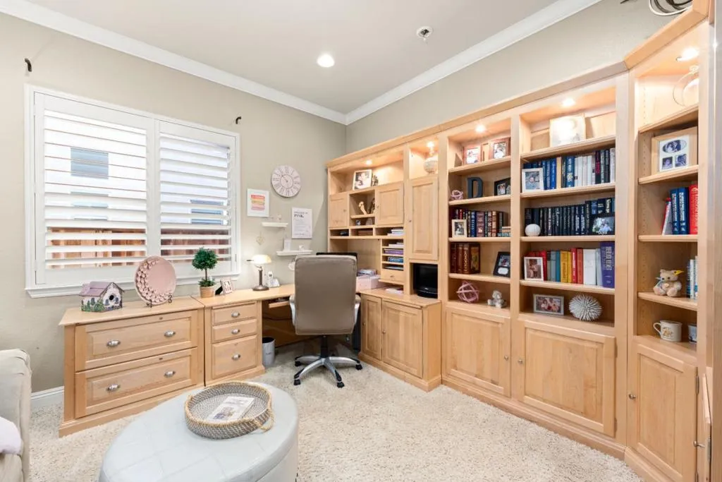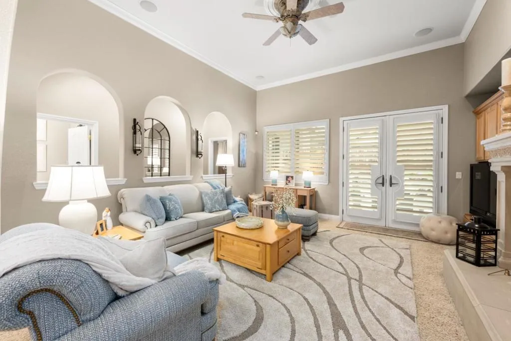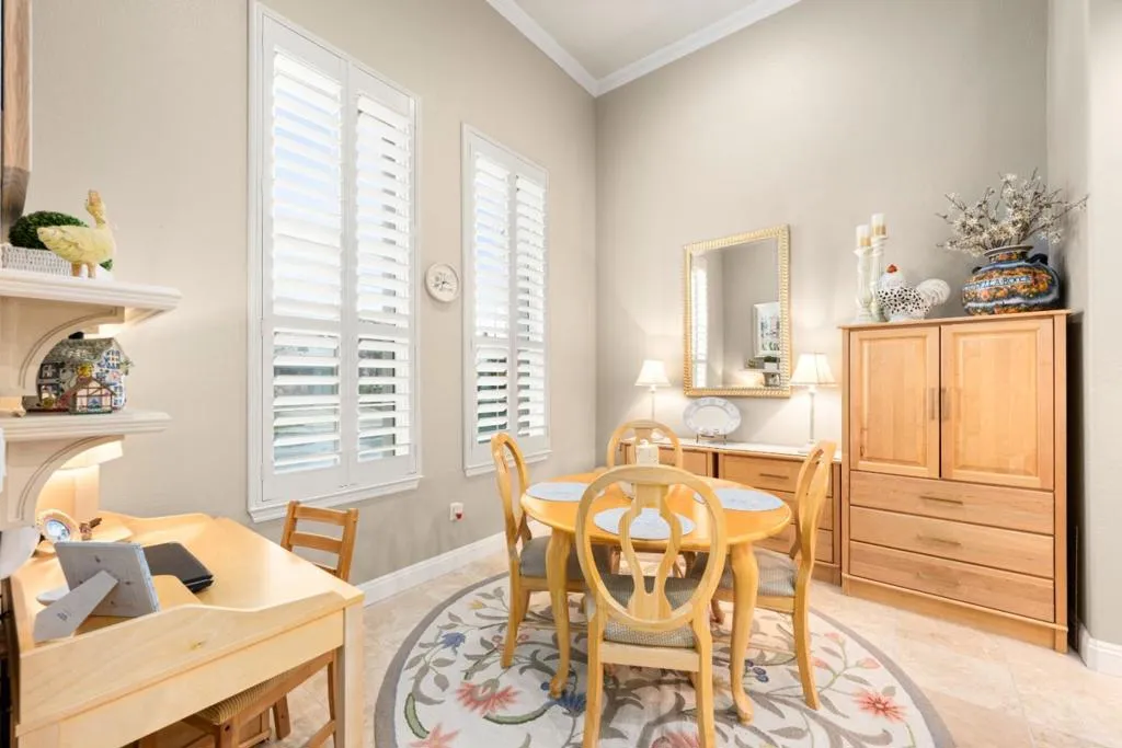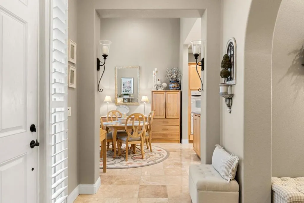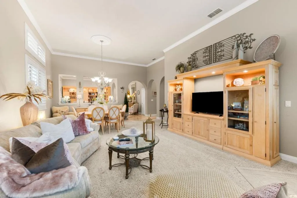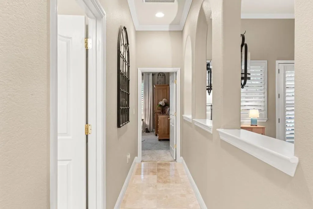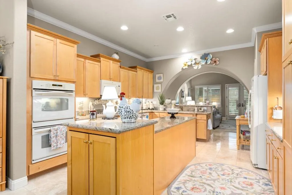 Set in the sought-after Heritage Park 55+ community, this Pacifica model welcomes you with a timeless stone-accent elevation, designer entry, and manicured landscaping that instantly feels done right. Inside, natural light pours through wide plantation shutters and tall windows, highlighting crown molding throughout, 4-inch baseboards, and elegant travertine flooring that carries the home with a clean, upscale finish. The heart of the home is the spacious kitchen, rich natural maple cabinetry, granite countertops, a large center island, and coordinated bisque appliances including double ovens. The layout flows into the comfortable family room with a cozy fireplace, while French doors off the family room, living room, and primary suite create seamless indoor-outdoor living. Step outside to a private, low-maintenance retreat featuring turf lawn, a tranquil waterfall and pond, a large equipment shed, and a built-in barbecue; ideal for relaxing afternoons and effortless hosting. A standout garage with epoxy flooring, full perimeter cabinetry, dual closets (including a cedar closet), plus a workbench with Formica countertop. A rare combination of quality, comfort, and thoughtful upgrades in one of Natomas premier active-adult communities.