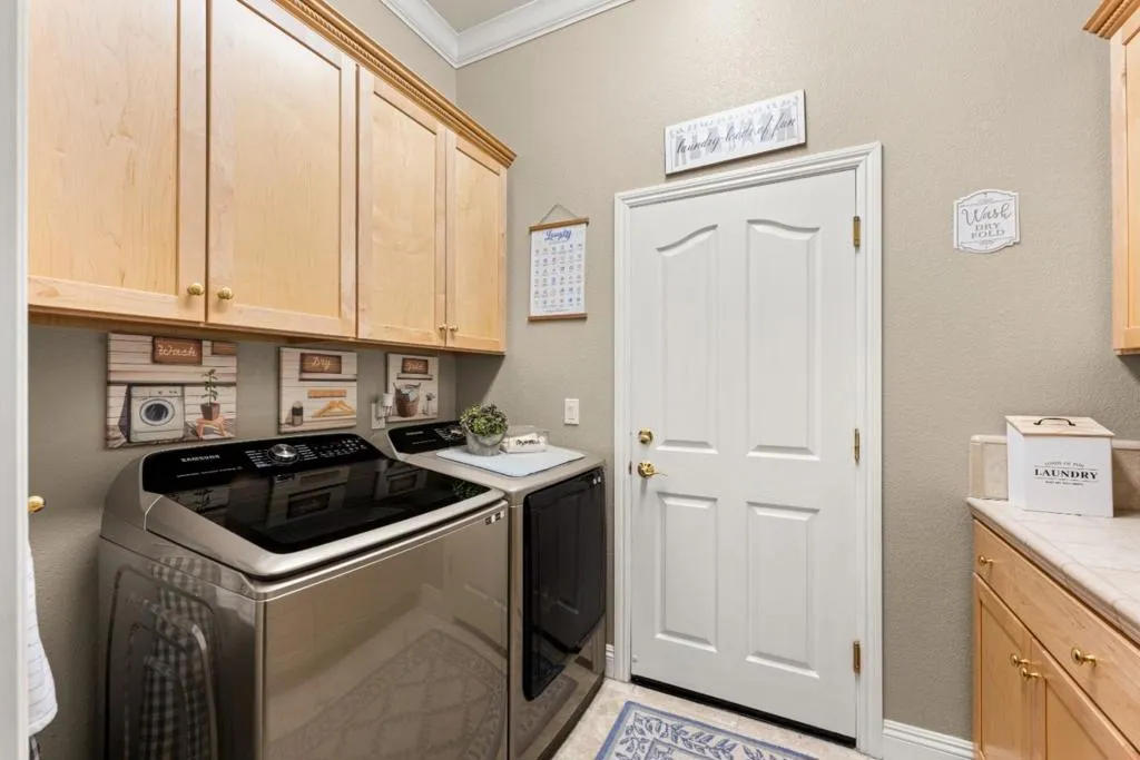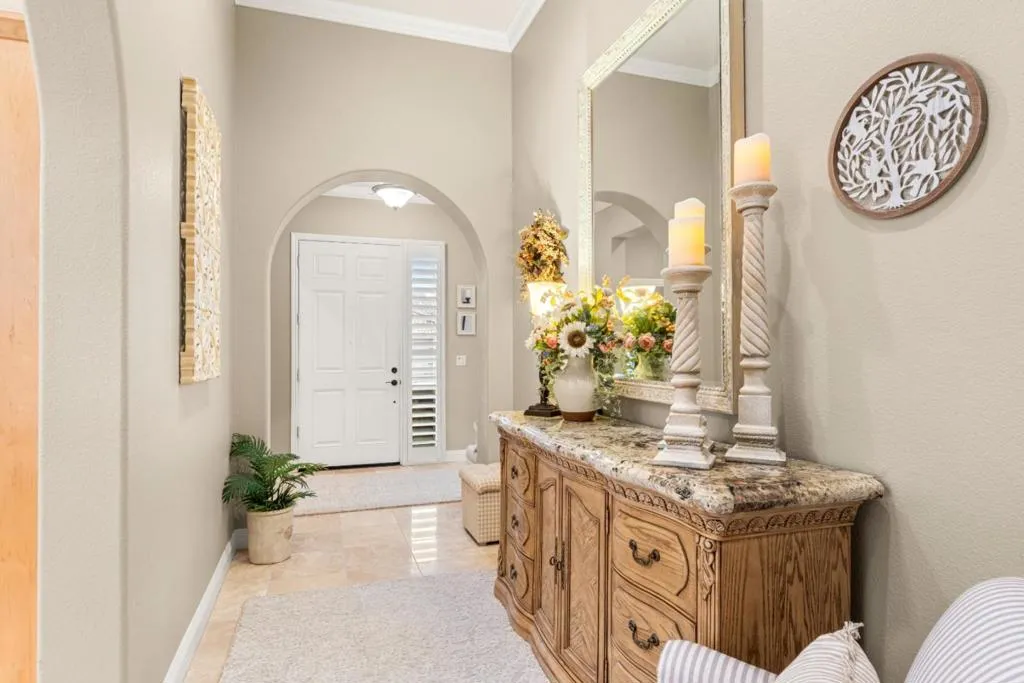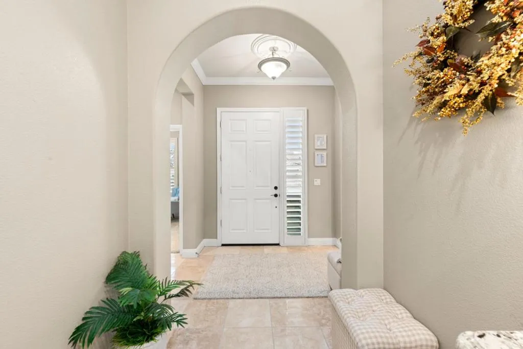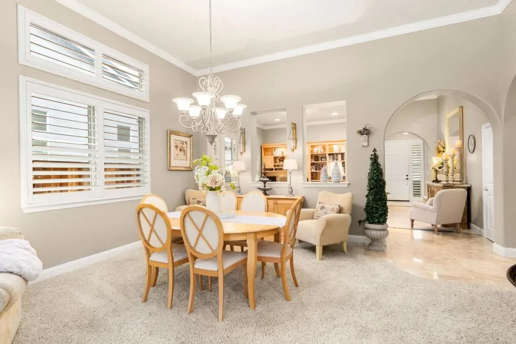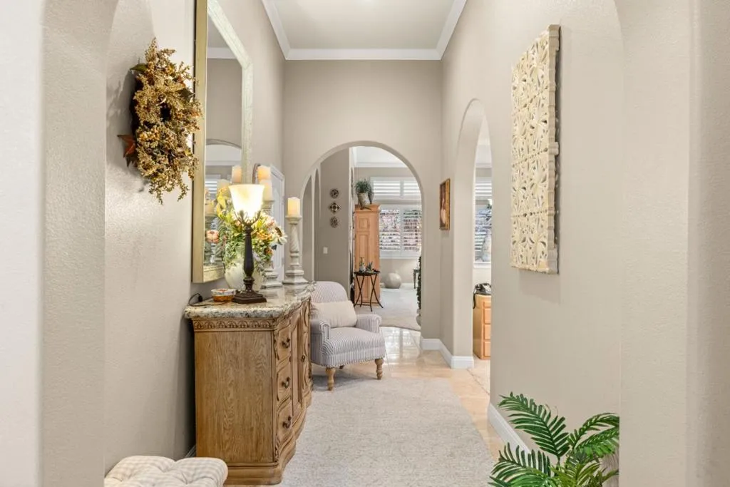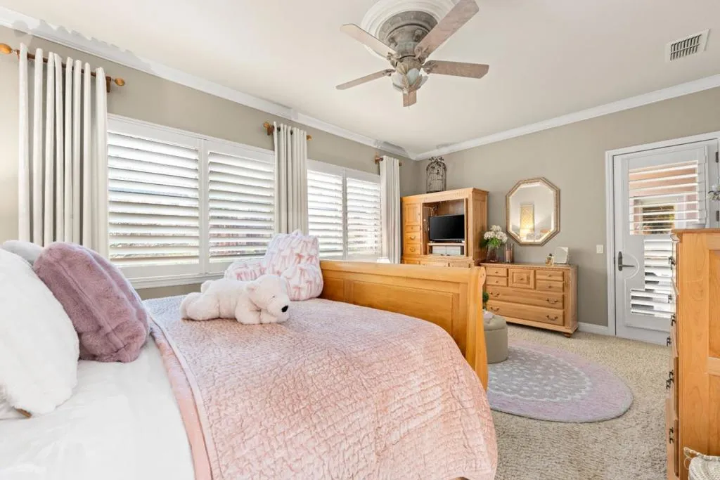 Set in the sought-after Heritage Park 55+ community, this Pacifica model welcomes you with a timeless stone-accent elevation, designer entry, and manicured landscaping that instantly feels done right. Inside, natural light pours through wide plantation shutters and tall windows, highlighting crown molding throughout, 4-inch baseboards, and elegant travertine flooring that carries the home with a clean, upscale finish. The heart of the home is the spacious kitchen, rich natural maple cabinetry, granite countertops, a large center island, and coordinated bisque appliances including double ovens. The layout flows into the comfortable family room with a cozy fireplace, while French doors off the family room, living room, and primary suite create seamless indoor-outdoor living. Step outside to a private, low-maintenance retreat featuring turf lawn, a tranquil waterfall and pond, a large equipment shed, and a built-in barbecue; ideal for relaxing afternoons and effortless hosting. A standout garage with epoxy flooring, full perimeter cabinetry, dual closets (including a cedar closet), plus a workbench with Formica countertop. A rare combination of quality, comfort, and thoughtful upgrades in one of Natomas premier active-adult communities.