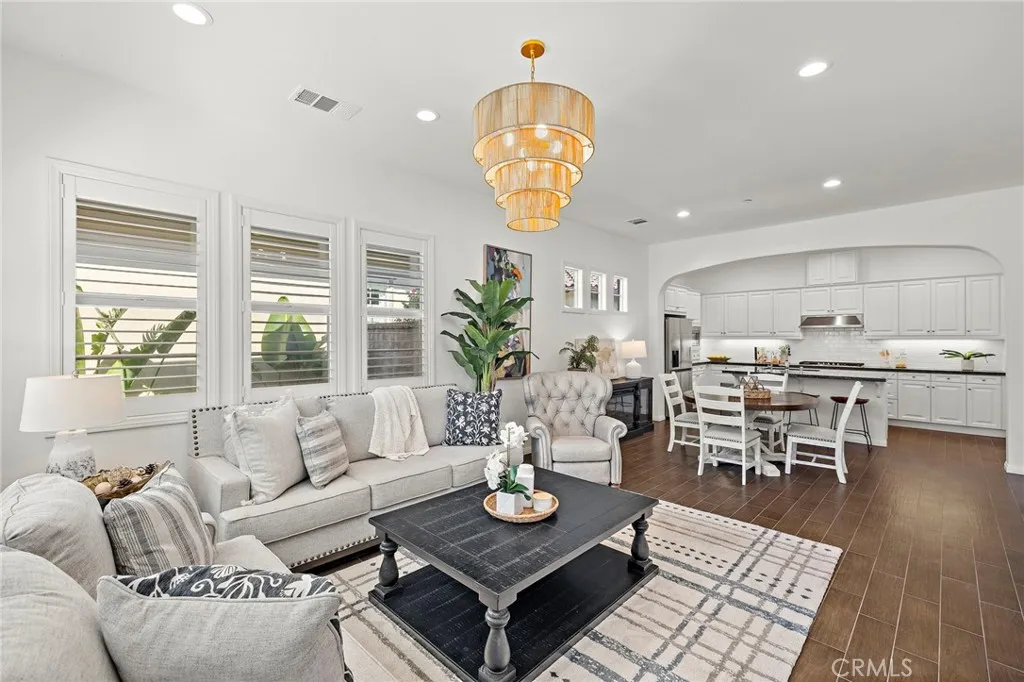 Welcome to a True Single Story retreat nestled in the heart of gated Gavilan Village in Rancho Mission Viejo. This elegant standalone home offers a perfect blend of comfort and style, featuring 3 bedrooms and 2 bathrooms and no attached walls. Designed with an open-concept layout, the living space flows seamlessly, enhanced by high ceilings and modern LED recessed lighting. Beautiful kitchen boasting white cabinetry, stainless steel appliances, gleaming granite countertops, a walk in pantry and an expansive island that doubles as a hub for casual gatherings. The adjacent dining area is large enough for a 6 person dining table and flows into the family room. Your built-in media cabinet is a focal point for the family room and can accommodate an 85" TV for those sports watching gatherings. The home is masterfully designed with privacy in mind positioning the Primary bedroom on one side of the home and the secondary bedrooms on the other side down a hallway. The primary suite is a sanctuary with beautiful chandelier and plantation shutters plus a luxurious en-suite bathroom, featuring double sinks, limestone countertops, an oversized walk-in shower, and walk-in closet. Both secondary bedrooms have overhead chandeliers as well as plantation shutters. They share the full bath with tub/shower combination, framed mirror and quartz countertops. This home is also equipped with a laundry room with upper cabinets, sink and included washer/dryer. The garage has been outfitted with epoxy floors, storage cabinetry and a whole house water softener. Step outside to enjoy the private backyard, beautifully designed with custom pavers and beautiful plants- ideal for hosting friends and family. For recreation, residents benefit from exceptional community amenities steps away at the Hacienda Club including a sparkling pool, relaxing spa, and vibrant club house with clubhouse, workout gym, card rooms and yoga studio. Residents also enjoy access to all of the amenities RMV has to offer including 2 additional 55+ pools, plus all age Amenities including putting green, firepits, bars, and more. One of the beauties of this home is that Gavilan Sendero offers the lowest rate of Mello Roos in RMV and will be significantly less than the Rienda properties. Yet, you are walking distance to the Sendero Gavilan Amenities and have access to all of the other amenities in all three villages. Experience the best of Rancho Mission Viejo living in this exquisite property.