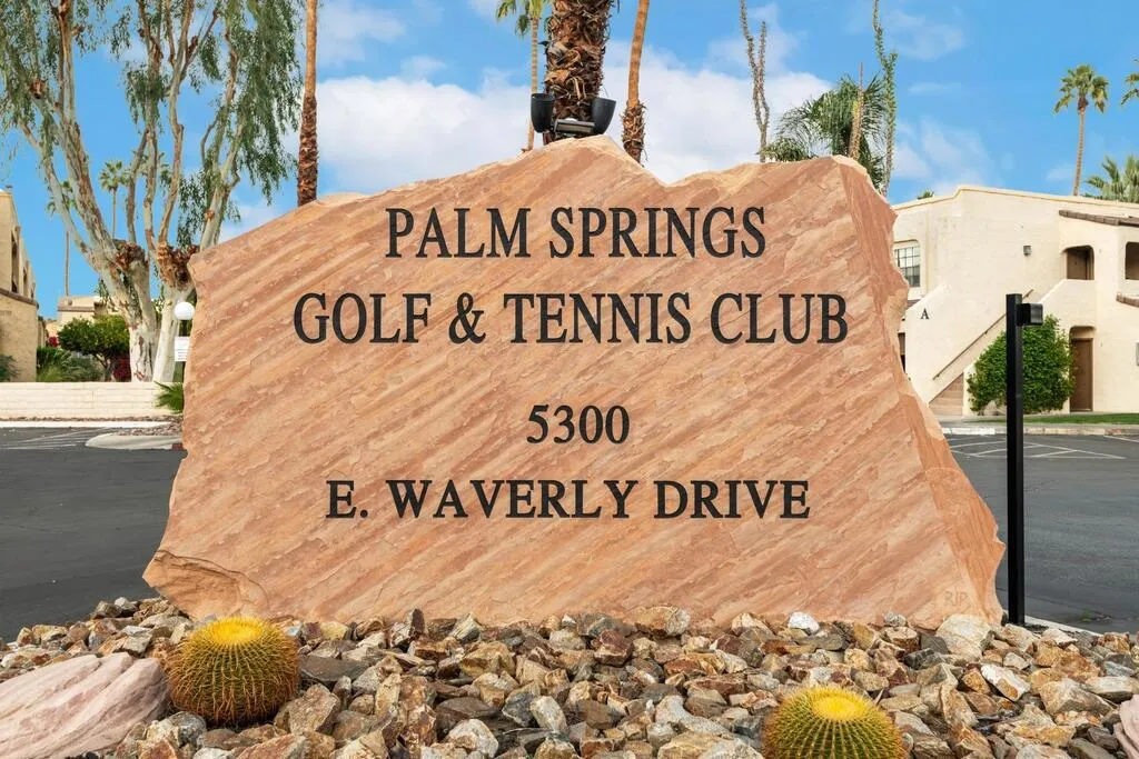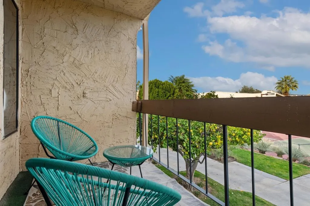 Exceptional opportunity to own a fully furnished, upgraded two-story townhouse-style condo in South Palm Springs. This spacious 1,048-square-foot residence offers one of the largest floor plans in the community and is one of only six units out of 205 featuring this rare two-story townhouse layout. The home includes two full bathrooms, multiple storage closets, and private outdoor spaces on both levels, providing an ideal balance of openness and privacy. The expansive upstairs primary suite functions as a true sanctuary, offering a generous sleeping area, a dedicated wet bar, private bathroom, and a large walk-in closet that can easily serve as a home office, creative space, or additional storage. The suite opens to a private balcony overlooking the tennis courts, creating a quiet and elevated living experience rarely found in condo living. Additional highlights include dual air-conditioning and heating systems with separate units for each floor, an in-unit washer and dryer, and a thoughtful floor plan designed for comfort and efficiency. Located in the highly desirable Palm Springs Golf & Tennis Club community, residents enjoy resort-style amenities including three heated pools, spas, tennis and pickleball courts, a clubhouse, and beautifully maintained grounds with mature landscaping and citrus trees. HOA dues include cable, high-speed internet with Wi-Fi, water, trash service, and exterior and roof maintenance. No land lease. Conveniently situated on the Tahquitz Creek Golf Course and close to grocery stores, restaurants, coffee shops, and hiking trails, this property is ideal as a full-time residence or desert retreat.