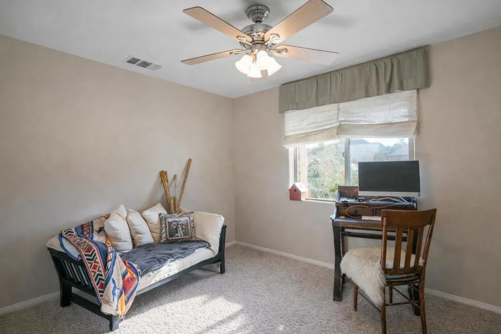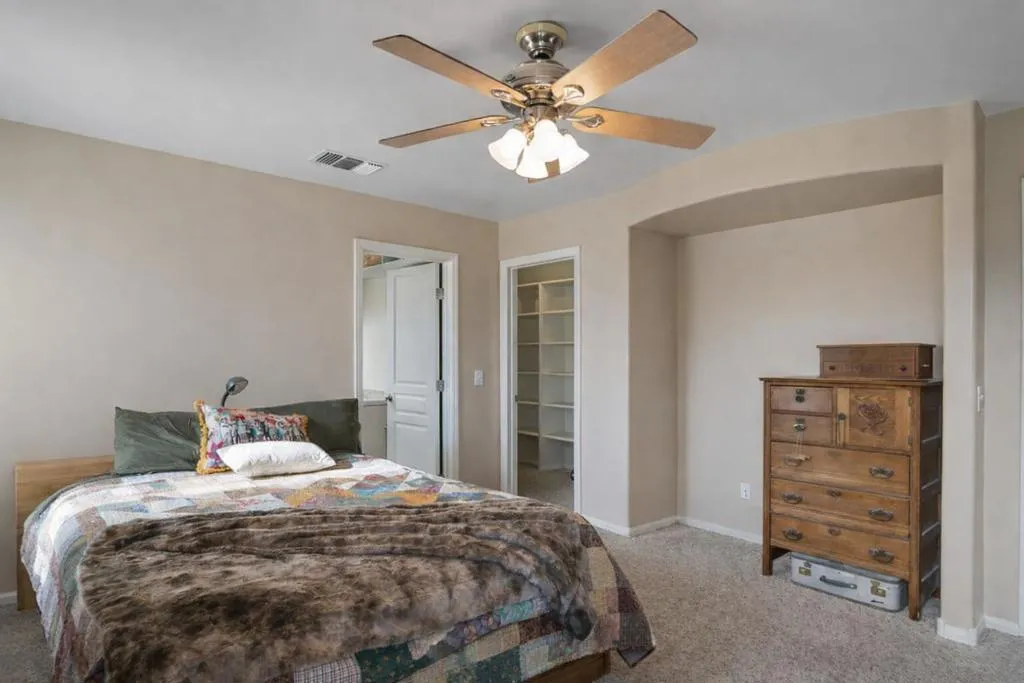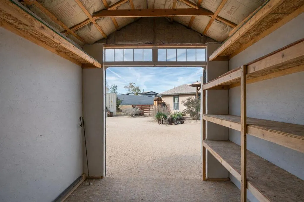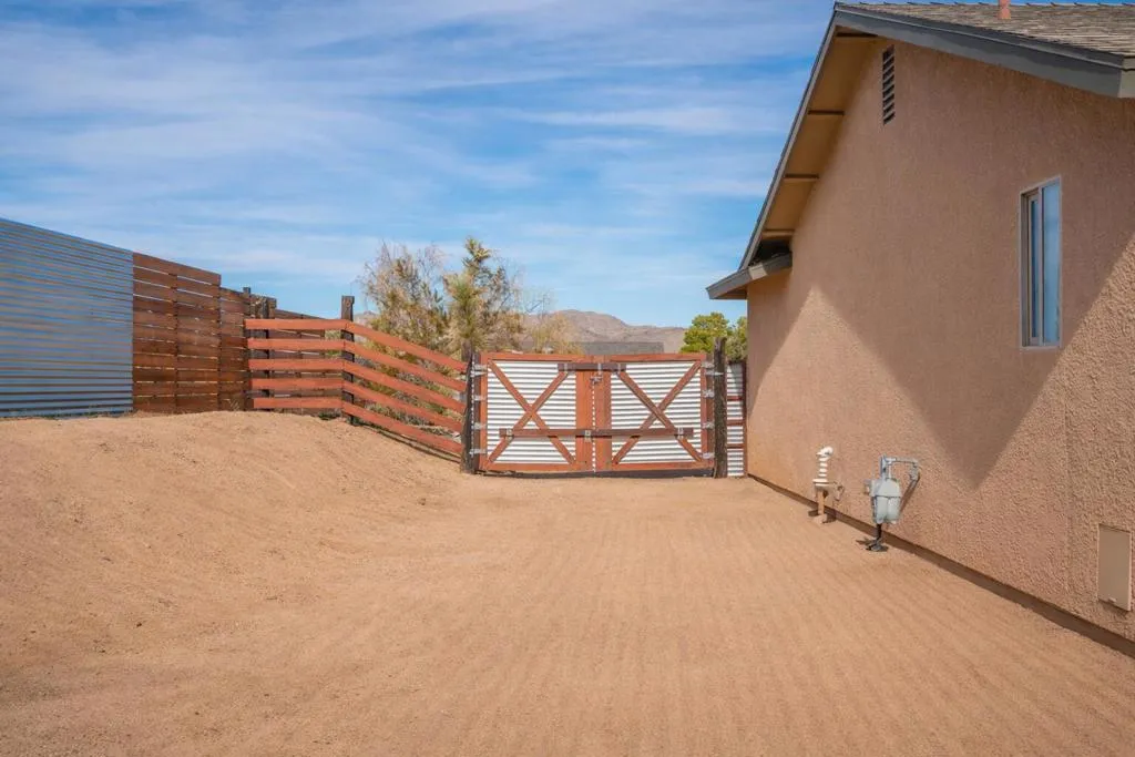 Beautifully appointed Tuscan-inspired 3-bedroom, 2-bath residence offering a bright, open floor plan filled with abundant natural light, ideally situated on an extra-large lot in the heart of Joshua Tree, just a short walk to downtown Joshua Tree Village. Located in a quiet, desirable neighborhood, this thoughtfully designed split-bedroom layout provides both privacy and functionality. From the moment you step through the front doors, the home feels warm, inviting, and welcoming, reflecting timeless Tuscan character blended with desert charm.The home features a grand exterior entry and showcases vaulted ceilings, elegant barrel rolls, bullnosed walls throughout, ceiling fans, and a built-in entertainment niche, creating a comfortable and refined living environment.The spacious primary suite includes a customized walk-in closet and an en-suite bathroom with dual sinks. The well-appointed kitchen highlights Tuscan stone tile countertops, porcelain tile flooring, a pantry, and a breakfast bar--ideal for both everyday living and entertaining. The guest bathroom is finished with Corian countertops, and dual-pane windows throughout enhance energy efficiency and year-round comfort.Additional features include natural gas heating, central air conditioning, and an oversized, fully finished two-car garage. The backyard offers a concrete patio with pergola just off the kitchen, mature landscaping with fruit trees, scenic views of surrounding rock formations, and a detached 8 ft x 12 ft insulated storage shed, perfect for additional storage or workspace. Exterior improvements include a concrete driveway, walkway, and patio, while the open interior layout maximizes natural light and livability.Enjoy exceptional stargazing from your own backyard--one of the true hallmarks of the Joshua Tree lifestyle.Buyer to independently investigate and verify all information, including but not limited to square footage, lot size, permits, zoning, utilities, property condition, and intended use. Listing agent and broker make no representations or warranties regarding the accuracy of information provided. Buyer is advised to rely on their own investigations and inspections.