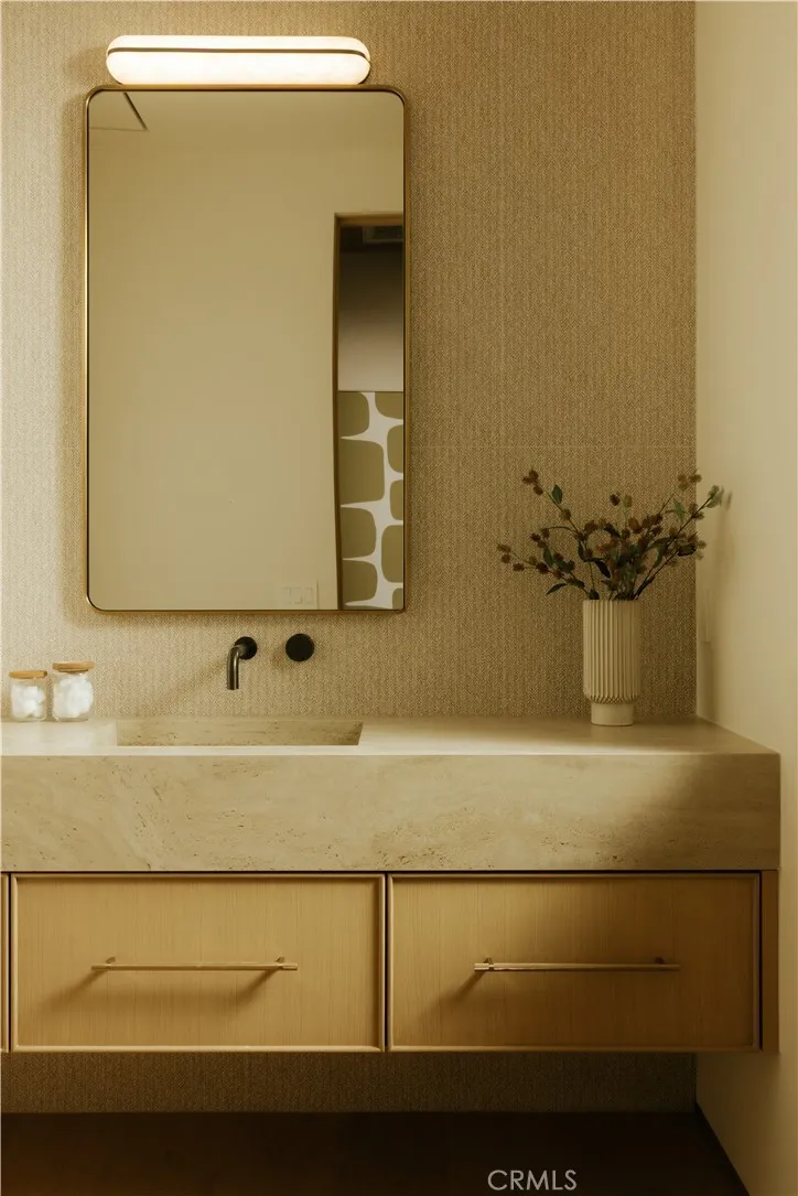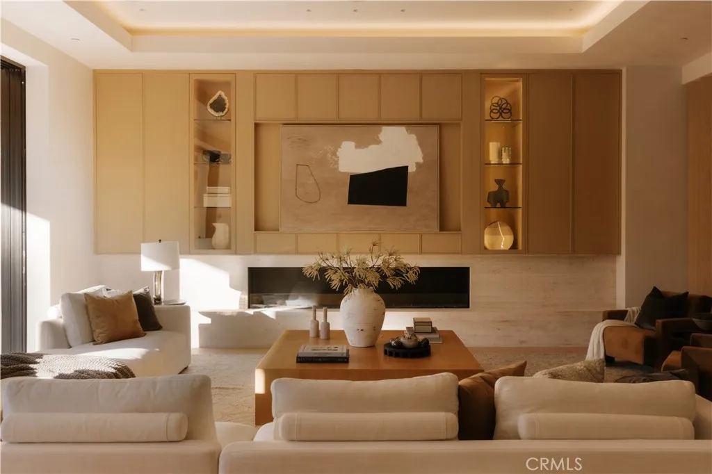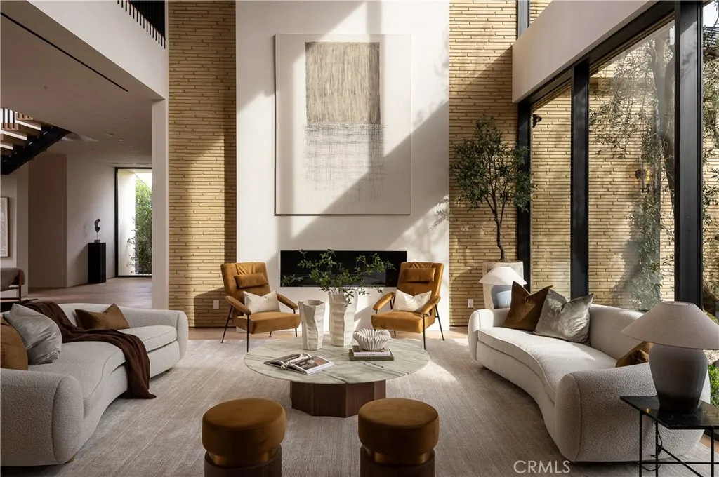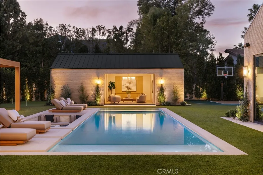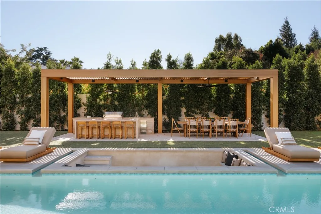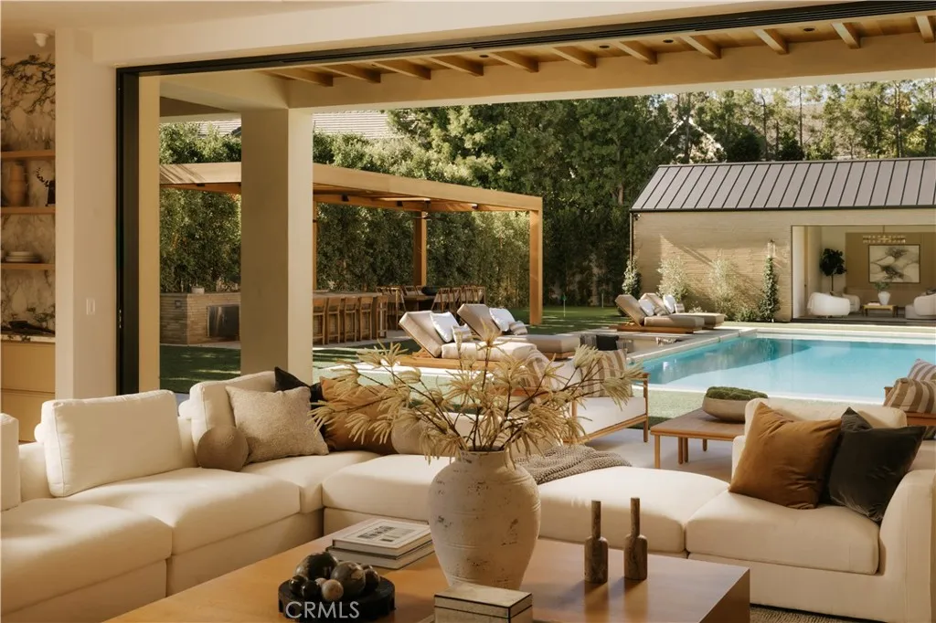 Introducing a masterfully crafted gated estate that redefines luxury living, privacy, and scale in the heart of Encino’s prestigious Royal Oaks enclave. Designed by acclaimed architect Eran Gispan and elevated by bespoke interiors from Sophea Design, the residence delivers a seamless balance of modern sophistication and resort-style living—crafted at the highest level. A grand circular motor court with paver detailing, and two mature olive trees creates a timeless sense of arrival and privacy. Inside, soaring two-story ceilings, hand-applied plaster walls, and warm wood detailing frame a light-filled, open floor plan. Wide-plank white oak floors extend throughout the entire home. The kitchen is a true statement of form and function, anchored by a double island wrapped in dramatic Calacatta Viola marble, Custom white oak cabinets, premium Miele appliances, and a separate prep kitchen with walk-in pantry. Adjacent to the dining area, a serving bar with limestone countertops and backsplash enhances entertaining flow, while the family room is defined by a sculptural travertine stone. The main residence features six bedrooms, all en-suite, in addition to an office, a dedicated movie theater, gym, lounge and game room. The primary suite is a private sanctuary, highlighted by a private balcony and a spa-inspired bath wrapped in leathered Taj Mahal stone, complete with a skylit shower that fills the space with soft natural light. Designed for year-round enjoyment, the grounds unfold as a true private resort. The expansive backyard includes an oversized pool with spa, sunken firepit, basketball court, putting green, generous grassy yard, and a fully equipped outdoor kitchen and barbecue—ideal for both intimate evenings and large-scale entertaining. Completing the compound is a detached guest house featuring one bedroom, one bathroom, and a living area, offering exceptional flexibility for guests, extended family, or a private studio. Additional highlights include a four-car garage, expansive gated driveway, exceptional privacy throughout, and a full Control4 smart-home system managing lighting, climate, interior and exterior audio, alarm system, and security cameras. Located moments from Ventura Boulevard’s premier dining and boutique shopping, and within the highly coveted Lanai Road School District. This one-of-a-kind estate offers the scale of a private compound, the sophistication of a designer residence, and the lifestyle of a world-class retreat.