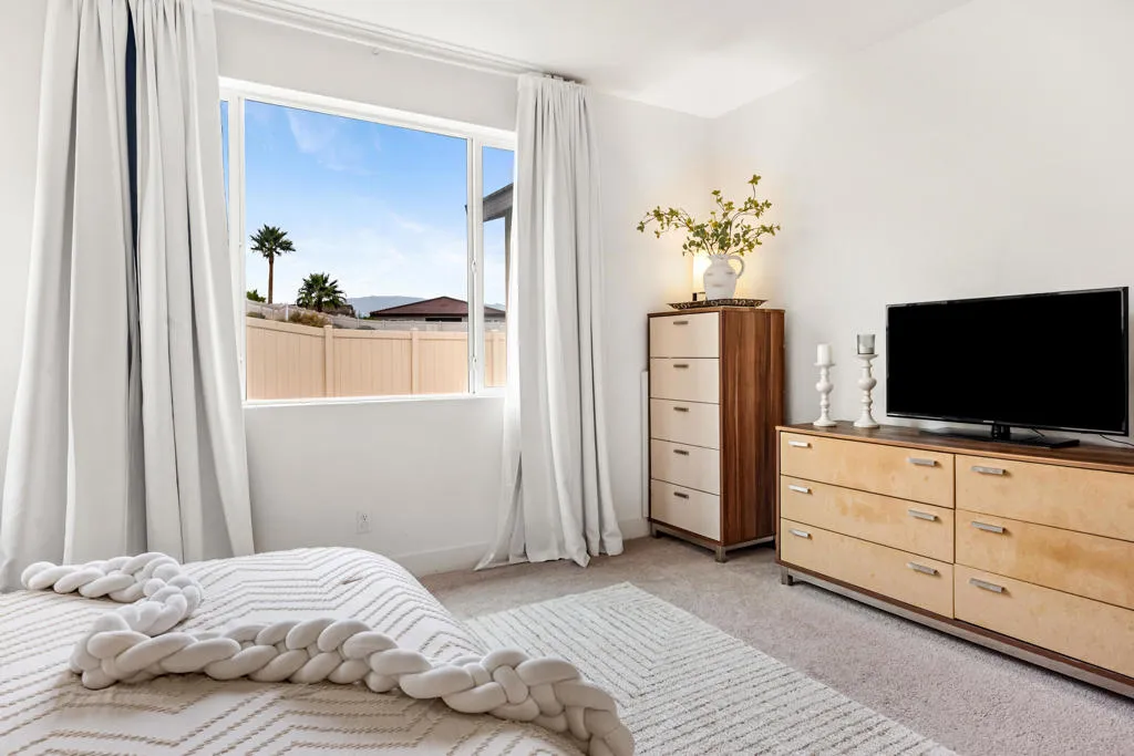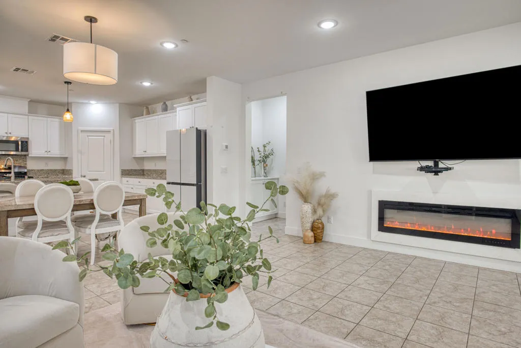 Welcome to this beautifully upgraded single-story home, thoughtfully designed for comfort, functionality, and modern living. Offering 3 bedrooms and 2 bathrooms, the home features an inviting open-concept layout ideal for both everyday living and effortless entertaining. Tasteful finishes and carefully curated upgrades create a cohesive and welcoming atmosphere throughout.The living area is anchored by a custom modern electric fireplace with heat, that adds warmth and architectural interest, while the primary suite is enhanced by a custom walk-in closet offering storage and organization. A spacious side yard provides rare flexibility, with the potential to accommodate a third parking space--an exceptional convenience.Tucked away on a peaceful cul-de-sac with no rear neighbors, the property enjoys enhanced privacy and a peaceful setting. The backyard is finished with premium, pet-friendly, heat-resistant turf that remains cool underfoot, even in warmer temperatures.Perfect for relaxing, entertaining, or enjoying quiet evenings at home, the outdoor area serves as a serene extension of the living space. Located in a well-maintained and desirable community, this home offers an ideal blend of style, comfort, and convenience. A wonderful opportunity not to be missed!