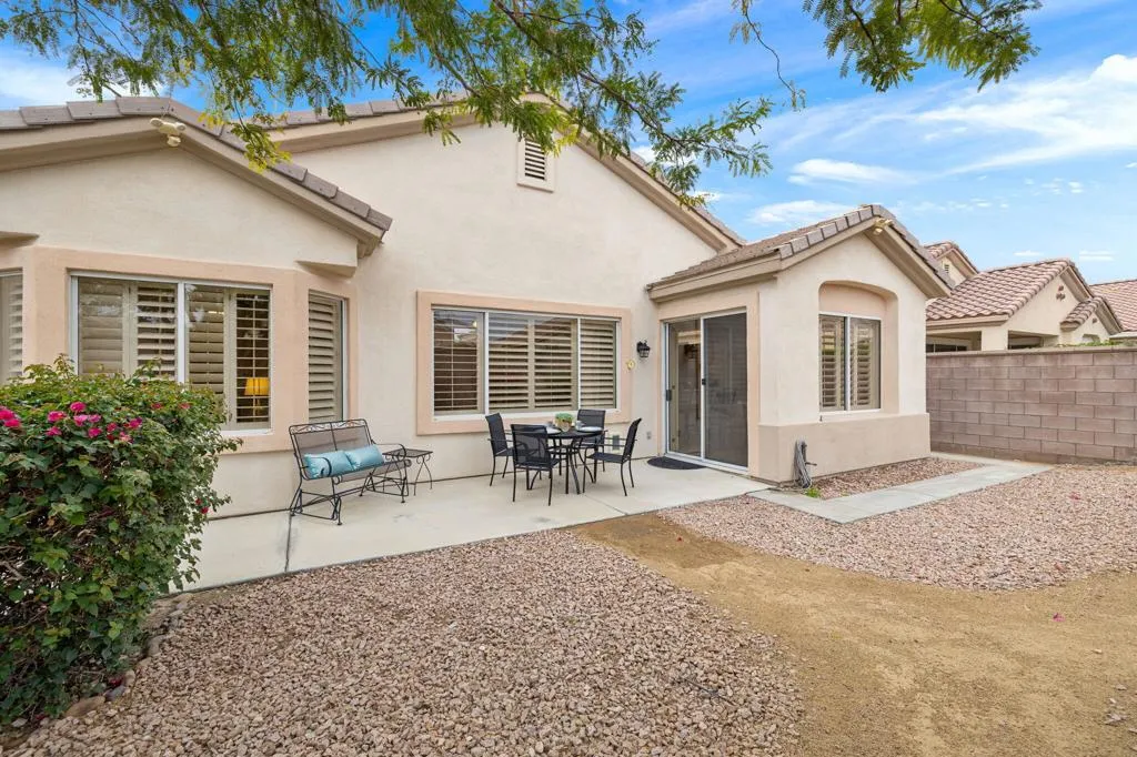Located in the most desirable 55+ community in the Valley, Sun City Palm Desert, this Lanai Model is one of the most popular. It has a NEWER HVAC in 2020, and plantation shutters throughout. It has 2 bedrooms separated on either side of the home, and 2 full bathrooms. The kitchen has newer stainless appliances, with an eating bar, and a kitchenette dining area. It views through to the living room and to the nicely landscaped backyard. The master bedroom has a bay window, walk-in shower, double vanity, walk-in closet and a private toilet room. The guest bedroom is adjacent to the 2nd full bath and is very inviting and comfortable. The laundry room have upper cabinets, and includes the washer and dryer. The garage is extended, making room for 2 cars and at least one golf cart. It has a central vac that hasn't been used and is included AS-IS. The backyard is very pleasant and private, with fruit trees and a walk-around path.