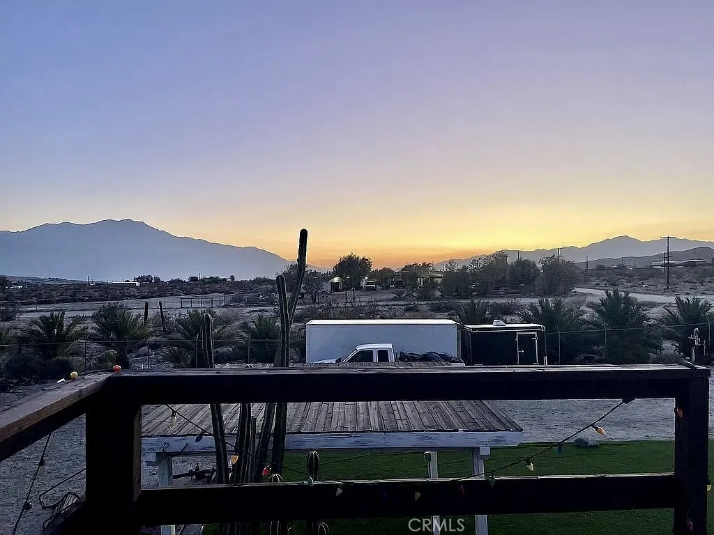 Escape the city and enjoy serene, private living on this gorgeous 2.5-acre property featuring over 65 Medjool Date trees with room to plant many more. Zoned for agriculture and equestrian use, this secluded retreat offers spectacular mountain and desert vistas, perfect for appreciating stunning sunsets, sunrises, and starry nights in peace. The charming, furnished 4-bedroom, 1-bath Sky Valley home boasts a European kitchen with white and gray granite countertops, Old World cabinetry, and spacious dining area. The bathroom features a high vanity with a glass bowl sink and an open tile shower. The living room is warm and inviting, with French doors and a real wood-burning stove, complemented by a spacious 6’ x 40’ screened-in porch for outdoor relaxation. A fourth bedroom on the west side of the home provides additional flexibility. Outside, the property includes a trailer for a project ideal for guests, a caretaker, or in-law quarters as well as four sheds for storage. For entertainment and gatherings there is 20’x40’ concrete slab on the lower part of the property offers versatile space for additional projects or structures. The home is partially gated for privacy and features a covered carport, making it perfect for families, artists, musicians, or contractors seeking a peaceful rural lifestyle. This property offers a unique blend of natural beauty, functional living spaces, and agricultural potential, or just a private getaway for those seeking a weekend home