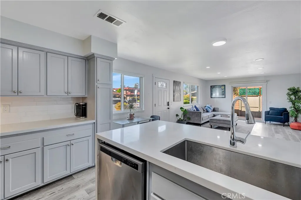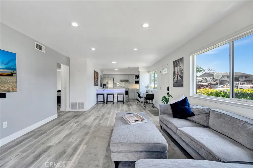 Rare single-story, ground-level unit with no stairs and no one above or below. Located in Harbor Heights Villas, surrounded by landscaped greenbelts and near the community pool and clubhouse. Light-filled open floor plan with updated kitchen featuring refreshed cabinetry and stainless steel appliances, including refrigerator. Kitchen opens to dining area and living room with smooth ceilings and tile flooring. Dual-pane windows and sliding door, recessed lighting with smart switch, Ring doorbell, ceiling fans, and laminate flooring in both bedrooms. One bedroom includes built-in storage bench. Upgraded full bathroom with custom tile tub/shower and updated fixtures. Private patio and indoor laundry inside the unit. Includes one designated parking space and storage in shared two-car garage (half garage per unit). HOA amenities include pool, clubhouse, basketball court, RV parking, water and trash. Close to Huntington Harbor, beaches, shopping, dining, and approximately 1.3 miles to Bolsa Chica Wetlands