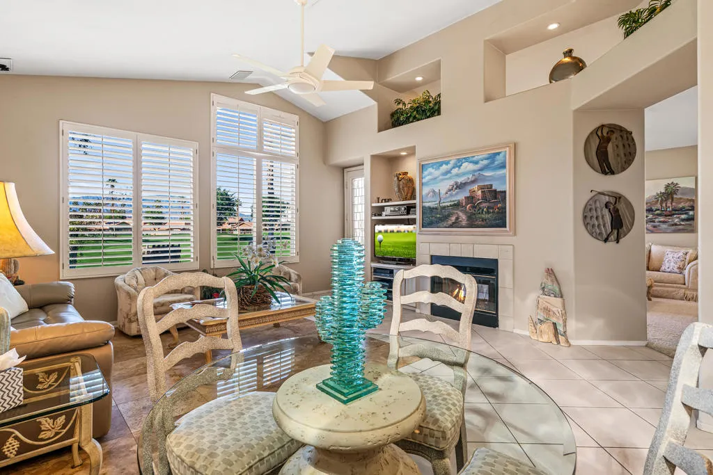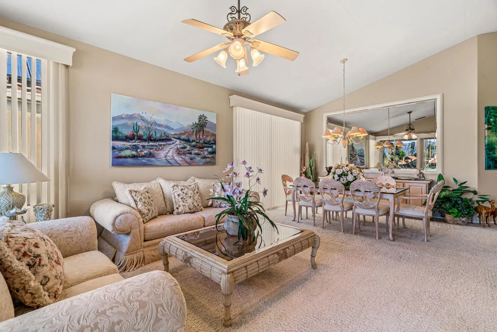 This home features three bedrooms and two bathrooms and is the largest floor plan in the Oasis, providing a spacious and comfortable layout. 3rd bedroom is being used as an office and the other two bedrooms have large walk in closets. Nicely furnished the interior is filled with natural light, with windows that capture the surrounding landscape. The golf course frontage and well designed patio is ideal for both everyday living and entertaining. Golf cart included!! Its prime location within the community provides effortless access to pools, the clubhouse, pickleball courts, and the full range of activities Oasis Country Club is known for. Residents enjoy the amenities, including 18 pools, an 18-hole executive course recognized as one of the finest in California, an 18-hole putting course, a well-appointed pro shop, fitness room, fine dining, and the popular grill room. This is a move-in-ready opportunity in a highly desirable setting--perfect for those seeking comfort, convenience, and an exceptional country club lifestyle.