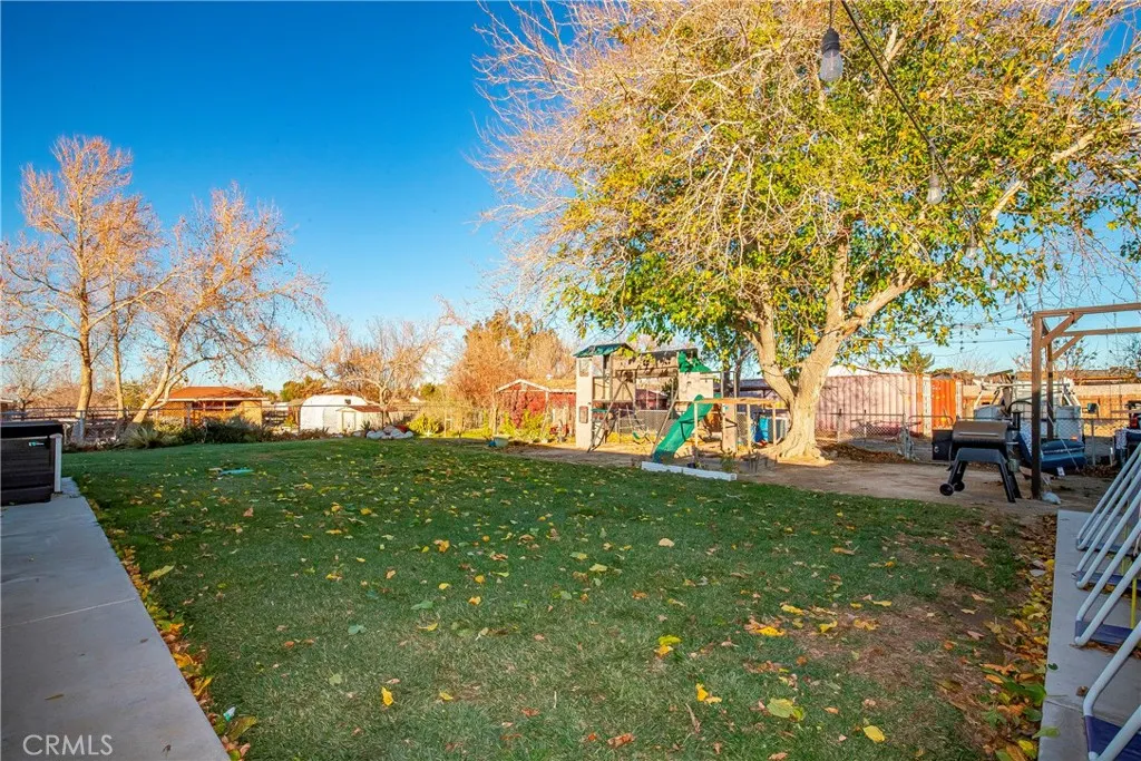 Welcome to this charming ranch-style single-level home. Built in 1990, this well-maintained 4-bedroom, 2-bathroom residence offers approximately 1,771 square feet of comfortable living space on a spacious half-acre lot—perfect for those seeking room to breathe in the beautiful high desert of the Antelope Valley. Paid off solar panels and tankless water heater makes this home energy efficient and new roof placed in 2018. Step inside to discover a recently renovated kitchen, new 8 burner stove, new dishwasher, drink fridge with coffee area, and 9 ft island that overlooks the living room. Tile flooring throughout provides easy cleanup. The inviting layout features 4 spacious bedrooms and 2 baths with new vanities, and ample natural light. The generous lot provides endless opportunities and has a covered RV parking area with 30 amp service, 2 large containers, a covered workshop with 220 volt ideal for welder/air compressor, outdoor shed, a play-set, jacuzzi, above ground pool, and large covered patio with alley access.