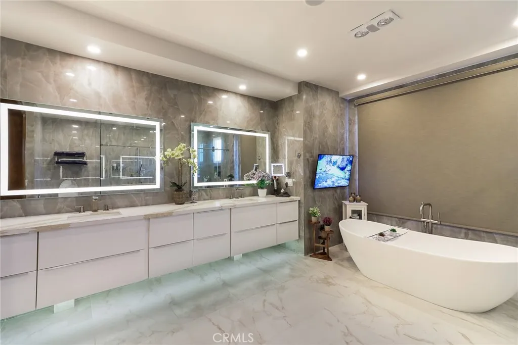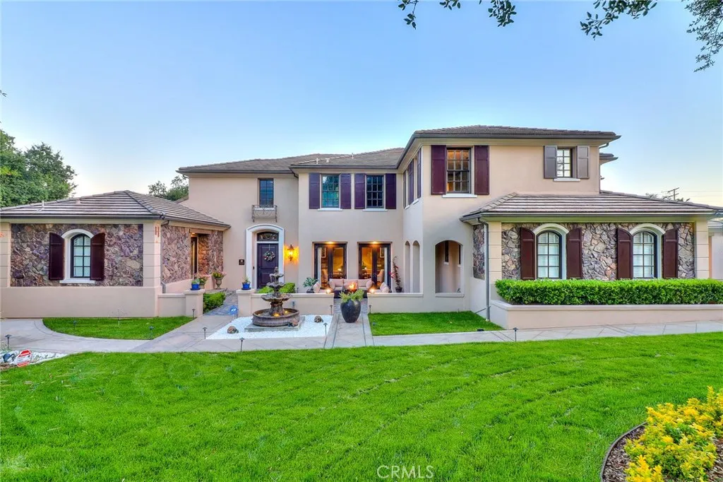 Welcome to luxury resort living in the exclusive guard-gated Anoakia community of Arcadia. This stunning estate offers 6 bedrooms (all ensuite), 1 office, 7 bathrooms, and a 3-car garage plus bonus room. The main level features two generously sized ensuite bedrooms plus a private office, ideal for multi-generational living or working from home. Upstairs, you’ll find three master suites and an exceptional Presidential Suite, all designed with elegance and privacy in mind. The front and backyard showcase brand-new water fountains and are finished with Castile Deva Acadia flooring, made in Spain. The home has been completely refreshed with brand-new exterior and interior paint, accented by gloss-finished stone, custom electric curtains, and a fully integrated advanced smart home system. Soaring ceilings and oversized windows flood the home with natural light. The formal dining room sits just off the hallway, highlighted by a crystal chandelier and oversized French doors, creating a picture-perfect space for gatherings. A pantry with Samsung wine cooler connects seamlessly to the dining room. French doors open to the front yard fountain, offering the perfect setting for afternoon tea with serene mountain views. The fully remodeled gourmet kitchen is a true showpiece, featuring top-of-the-line Viking commercial-grade appliances, Italian-made travertine flooring, quartz backsplash, Ruvati deep sink, and another crystal chandelier. An oversized quartz waterfall island anchors the space, surrounded by abundant custom cabinetry. Highlights include a Viking 7 Series range with teppan, grill, simmer burner, and Cool Lite LED lighting, a custom Decor smart refrigerator and freezer, Grohe pot filler and faucets, and a second kitchen area with a Viking single burner pot and wok station connecting to the breakfast nook. The completely remodeled Presidential Suite offers a private retreat. Enjoy a Kohler freestanding soaking tub, wall-mounted TV, expansive walk-in shower with custom frameless glass, TOTO Neorest bidet, and winter heat lamp. The suite also includes an attached office or nursery, makeup counter, spacious walk-in closet, and ultra-modern European cabinetry. Adjacent to the suite is a large office or second family room with custom built-ins. Additional features include a side-yard sport court, new concrete block walls, Rheem A/C systems, commercial-grade Culligan water system, smart sprinkler and drip systems with B-hyve, and more.